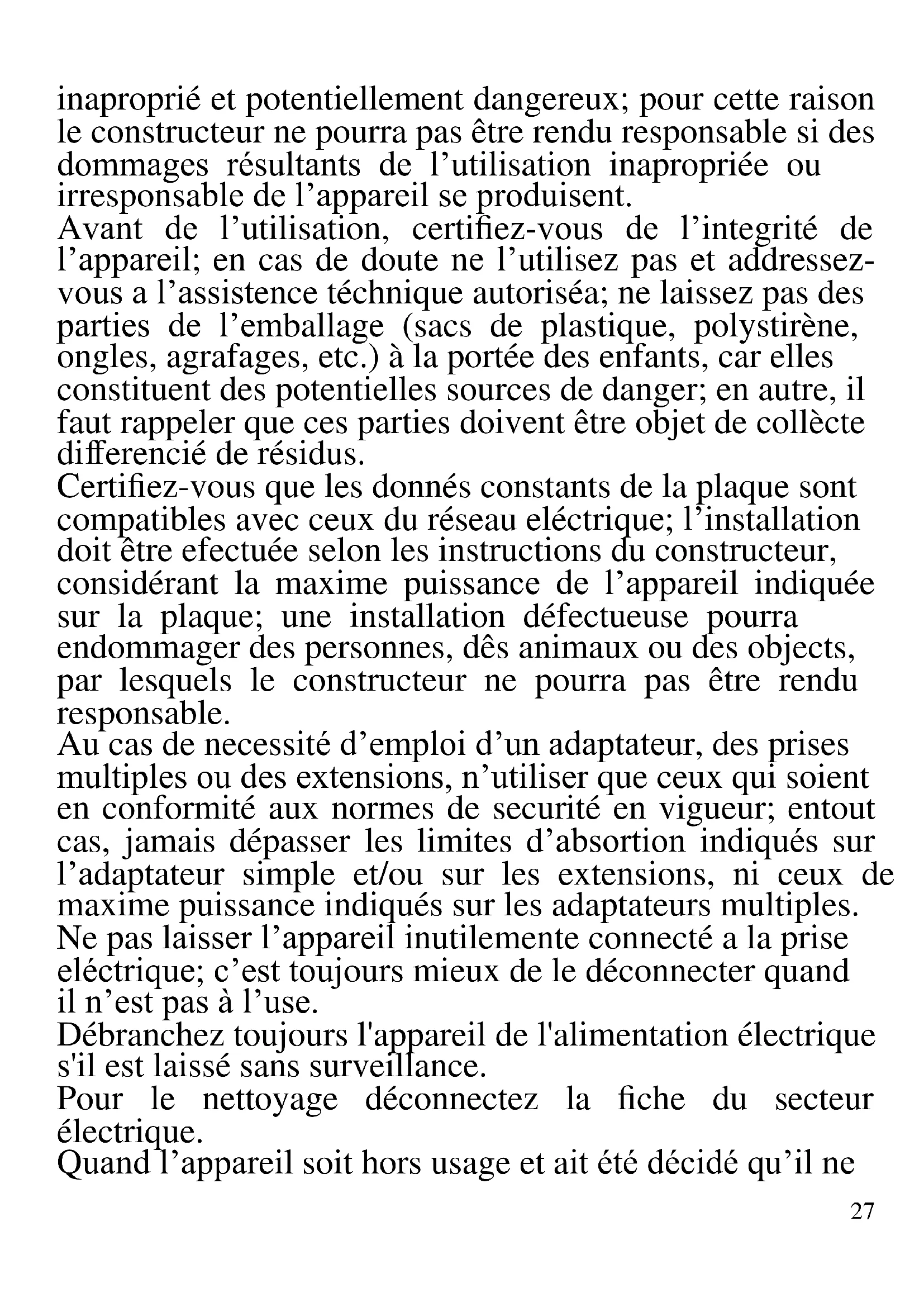 FRANCAIS: ADVERTISSEMENT Les indications suivantes sont très importantes en ce qui concerne l’installation, usage et manutention de cet appareil; gardez soigneusement ce manuel pour des futures consultations; n’utilisez pas l’appareil que selon les indications de ce manuel d’instructions; n’importe quel autre type d’ utilisation devra être consideré27 inaproprié et potentiellement dangereux; pour cette raison le constructeur ne pourra pas être rendu responsable si des dommages résultants de l’utilisation inapropriée ou irresponsable de l’appareil se produisent. Avant de l’utilisation, certifiez-vous de l’integrité de l’appareil; en cas de doute ne l’utilisez pas et addressez- vous a l’assistence téchnique autoriséa; ne laissez pas des parties de l’emballage (sacs de plastique, polystirène, ongles, agrafages, etc.) à la portée des enfants, car elles constituent des potentielles sources de danger; en autre, il faut rappeler que ces parties doivent être objet de collècte differencié de résidus. Certifiez-vous que les donnés constants de la plaque sont compatibles avec ceux du réseau eléctrique; l’installation doit être efectuée selon les instructions du constructeur, considérant la maxime puissance de l’appareil indiquée sur la plaque; une installation défectueuse pourra endommager des personnes, dês animaux ou des objects, par lesquels le constructeur ne pourra pas être rendu responsable. Au cas de necessité d’emploi d’un adaptateur, des prises multiples ou des extensions, n’utiliser que ceux qui soient en conformité aux normes de securité en vigueur; entout cas, jamais dépasser les limites d’absortion indiqués sur l’adaptateur simple et/ou sur les extensions, ni ceux de maxime puissance indiqués sur les adaptateurs multiples. Ne pas laisser l’appareil inutilemente connecté a la prise eléctrique; c’est toujours mieux de le déconnecter quand il n’est pas à l’use. Débranchez toujours l'appareil de l'alimentation électrique s'il est laissé sans surveillance. Pour le nettoyage déconnectez la fiche du secteur électrique. Quand l’appareil soit hors usage et ait été décidé qu’il ne28 sera pas reparé, on reccomande son inutilisation, en coupant son câble d’alimentation. - Ne pas approcher le câble d’alimentation d’objects coupants ou de surfaces chaudes, et ne pas tirer sur le cordon d’alimentation pour le débrancher de la prise. Ne le laissez pas pendre du plan de travail où un enfant pourrait le tenir. - Ne pas utiliser l’appareil si le câble d’alimentation ou la fiche de connéction eléctrique sont endommagés, ou encore en cas de court-circuits; dans ce cas là, apporter l’appareil a un centre d’assistence autorisé. - L’appareil n’est pas indiqué pour être exposé à des conditions météorologiques défavorables (pluie, vent, humidité, la glace, etc.); Gardez-le dans un endroit sec. Jamais opérer ou même toucher l’appareil avec les mains mouillées ou les pieds nus. - Ce produit ne doit pas être utilisé par les enfants, même s'ils ont plus de 8 ans. - Cet appareil peut être utilisé par des personnes ayant des capacités physiques, sensorielles ou mentales réduites, ou qui manquent d'expérience ou de connaissances, si elles ont été correctement supervisées ou ont reçu des instructions pour utiliser cet appareil en toute sécurité. - Les enfants ne doivent pas jouer avec cet appareil. - Gardez l’appareil et le câble d’alimentation hors la portée des enfants agés de moins de 8 ans. Si le câble d'alimentation est endommagé ou en cas de panne et / ou de dysfonctionnement, ne modifiez pas l'appareil. Toute réparation doit être effectuée par le fabricant ou par son service d'assistance technique ou, en tout cas, par une personne possédant une qualification similaire, afin d'éviter tout risque. Le non-respect de ce qui précède peut compromettre la sécurité de l'appareil et invalider les conditions de la garantie.29 - Cet appareil est destiné à être utilisé dans les ménages et des applications similaires: les cuisines du personnel dans les magasins, bureaux et autres environnements de travail, pour les clients dans les hôtels, motels et autres environnements de type résidentiel, de type lit et petit- déjeuner, hébergement. - L’appareil n’est pas conçu pour être utilisé avec une minuterie extérieure ou un commande à distance. - N’utiliser que des accéssoires e pièces d’origine. - Avant chaque utilisation, effectuez le cordon d'alimentation. Ne soumettez pas le produit à des chocs susceptibles de l'endommager. - Tenir l’appareil à l’écart des environnements où il peut y avoir des gaz, vapeurs, des substances inflammables ou explosives.
