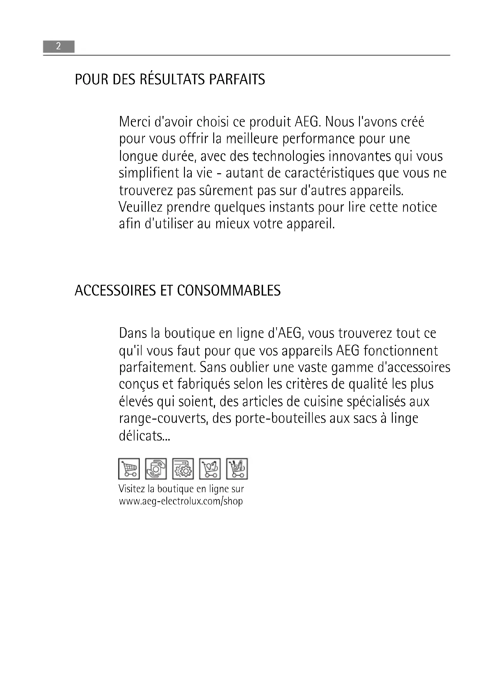 Dans la boutique en ligne d'AEG, vous trouverez tout ce qu'il vous faut pour que vos appareils AEG fonctionnent parfaitement. Sans oublier une vaste gamme d'accessoires conçus et fabriqués selon les critères de qualité les plus élevés qui soient, des articles de cuisine spécialisés aux range-couverts, des porte-bouteilles aux sacs à linge délicats... Visitez la boutique en ligne sur www.aeg-electrolux.com/shop 2SOMMAIRE 4 Consignes de sécurité 7 Installation 11 Description de l'appareil 11 Fonctionnement 13 Conseils utiles 14 Entretien et nettoyage 15 En cas d'anomalie de fonctionnement 17 Caractéristiques techniques 18 En matière de protection de l'environnement Les symboles suivants sont utilisés dans ce manuel: Informations importantes pour votre sécurité et pour éviter d’abîmer l’appareil. Informations générales et conseils Informations écologiques Sous réserve de modifications Sommaire