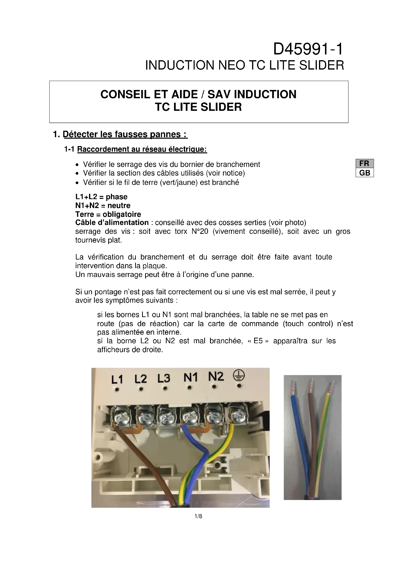 si les bornes L1 ou N1 sont mal branchées, la table ne se met pas en route (pas de réaction) car la carte de commande (touch control) n'est pas alimentée en interne.