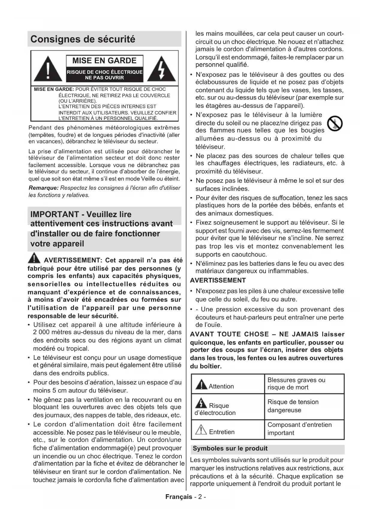 RISQUE DE CHOC ÉLECTRIQUENE PAS OUVRIRMISE EN GARDE: POUR ÉVITER TOUT RISQUE DE CHOC ÉLECTRIQUE, NE RETIREZ PAS LE COUVERCLE (OU L’ARRIÈRE). L’ENTRETIEN DES PIÈCES INTERNES EST INTERDIT AUX UTILISATEURS. VEUILLEZ CONFIER L'ENTRETIEN À UN PERSONNEL QUALIFIÉ.Remarque: Respectez les consignes à l'écran an d'utiliser les fonctions y relatives.Pendant des phénomènes météorologiques extrêmes (tempêtes, foudre) et de longues périodes d'inactivité (aller en vacances), débranchez le téléviseur du secteur.La prise d’alimentation est utilisée pour débrancher le téléviseur de l’alimentation secteur et doit donc rester facilement accessible. Lorsque vous ne débranchez pas le téléviseur du secteur, il continue d’absorber de l’énergie, quel que soit son état même s’il est en mode Veille ou éteint. IMPORTANT - Veuillez lire attentivement ces instructions avant d'installer ou de faire fonctionner votre appareil