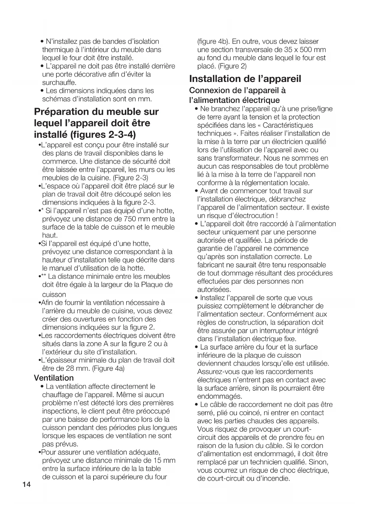 - Pour assurer une ventilation adéquate, prévoyez une distance minimale de 15 mm entre la surface inférieure de la la table de cuisson et la paroi supérieure du four (figure 4b). En outre, vous devez laisser une section transversale de 35 x 500 mm au fond du meuble dans lequel le four est placé. (Figure 2) Installation de l’appareil Connexion de l’appareil à l’alimentation électrique