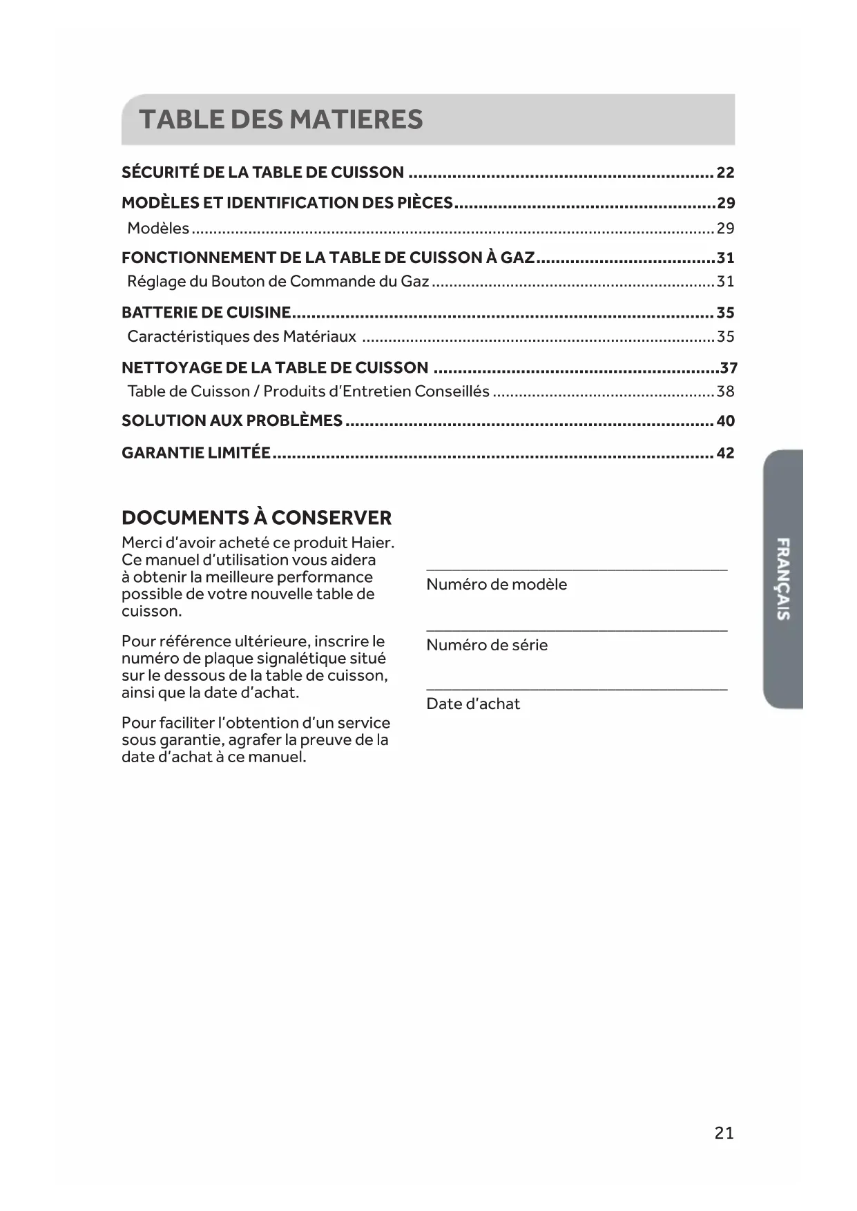 DOCUMENTS À CONSERVER Merci d’avoir acheté ce produit Haier. Ce manuel d’utilisation vous aidera à obtenir la meilleure performance possible de votre nouvelle table de cuisson. Pour référence ultérieure, inscrire le numéro de plaque signalétique situé sur le dessous de la table de cuisson, ainsi que la date d’achat. Pour faciliter l’obtention d’un service sous garantie, agrafer la preuve de la date d’achat à ce manuel.