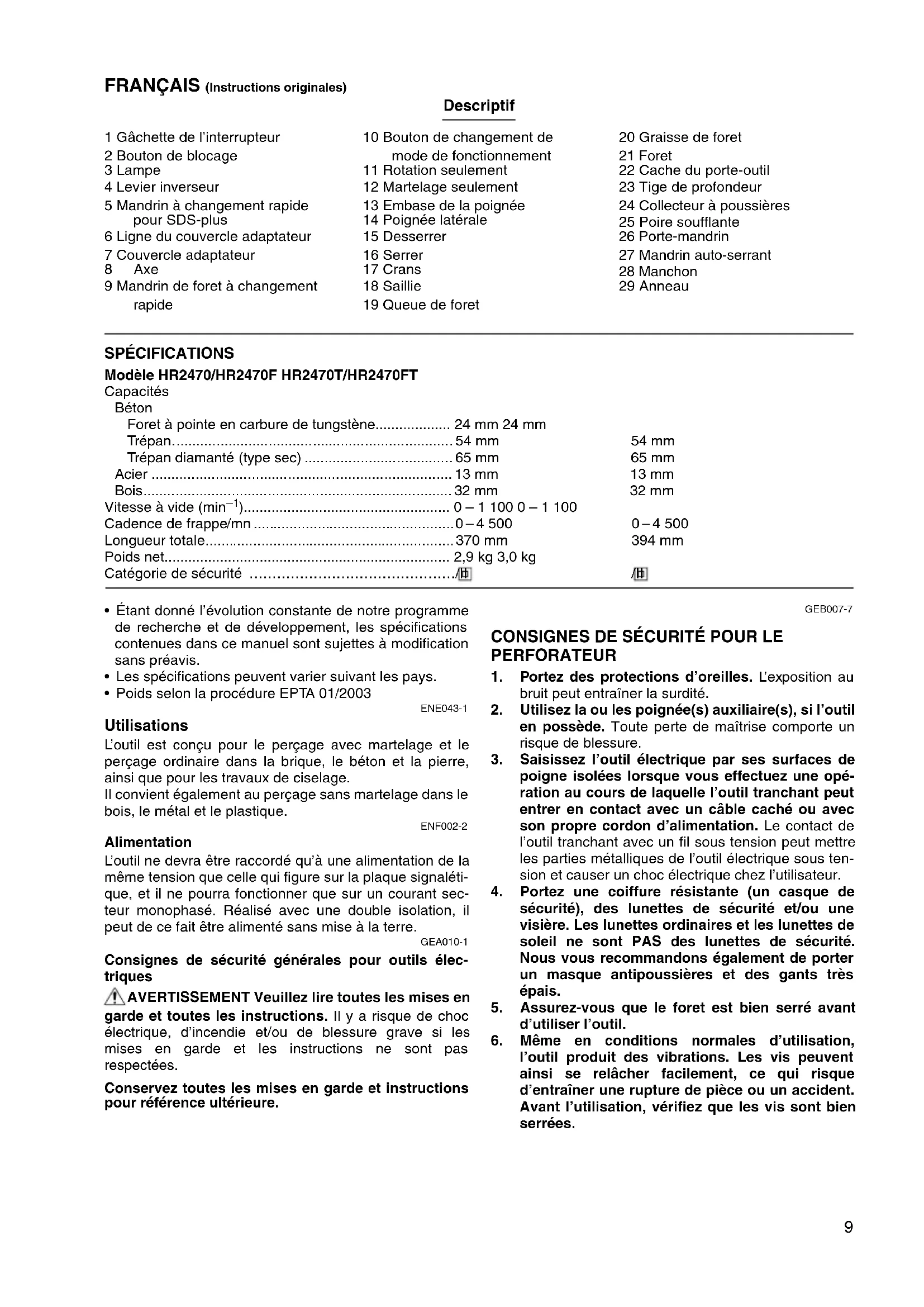 - For European countries only The EC declaration of conformity is included as Annex A to this instruction manual.9 FRANÇAIS (Instructions originales) Descriptif 1 Gâchette de l’interrupteur 2 Bouton de blocage 3 Lampe 4 Levier inverseur 5 Mandrin à changement rapide pour SDS-plus 6 Ligne du couvercle adaptateur 7 Couvercle adaptateur 8Axe 9 Mandrin de foret à changement rapide 10 Bouton de changement de mode de fonctionnement 11 Rotation seulement 12 Martelage seulement 13 Embase de la poignée 14 Poignée latérale 15 Desserrer 16 Serrer 17 Crans 18 Saillie 19 Queue de foret 20 Graisse de foret 21 Foret 22 Cache du porte-outil 23 Tige de profondeur 24 Collecteur à poussières 25 Poire soufflante 26 Porte-mandrin 27 Mandrin auto-serrant 28 Manchon 29 Anneau SPÉCIFICATIONS Modèle HR2470/HR2470F HR2470T/HR2470FT Capacités Béton Foret à pointe en carbure de tungstène p. 24