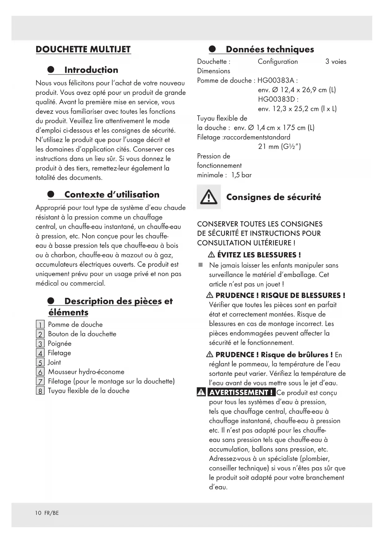 - s‘il présente les qualités qu‘un acheteur peut légitimement attendre eu égard aux déclarations publiques faites par le vendeur, par le producteur ou par son représentant, notamment dans la publicité ou l‘étiquetage ; 2° Ou s‘il présente les caractéristiques définies d‘un commun accord par les parties ou être propre à tout usage spécial recherché par l‘acheteur, porté à la connaissance du vendeur et que ce dernier a accepté. Article L217-12 du Code de la consommation L‘action résultant du défaut de conformité se prescrit par deux ans à compter de la délivrance du bien.12 FR/BE Article 1641 du Code civil Le vendeur est tenu de la garantie à raison des défauts cachés de la chose vendue qui la rendent impropre à l‘usage auquel on la destine, ou qui diminuent tellement cet usage que l‘acheteur ne l‘aurait pas acquise, ou n‘en aurait donné qu‘un moindre prix, s‘il les avait connus. Article 1648 1er alinéa du Code civil L‘action résultant des vices rédhibitoires doit être intentée par l‘acquéreur dans un délai de deux ans à compter de la découverte du vice. Les pièces détachées indispensables à l’utilisation du produit sont disponibles pendant la durée de la garantie du produit. Le produit a été fabriqué selon des critères de qualité stricts et contrôlé consciencieusement avant sa livraison. En cas de défaillance, vous êtes en droit de retourner ce produit au vendeur. La présente garantie ne constitue pas une restriction de vos droits légaux. Ce produit bénéficie d‘une garantie de 3 ans à compter de sa date d’achat. La durée de garantie débute à la date d’achat. Veuillez conserver le ticket de caisse original. Il fera office de preuve d’achat. Si un problème matériel ou de fabrication devait survenir dans 3 ans suivant la date d‘achat de ce produit, nous assurons à notre discrétion la réparation ou le remplacement du produit sans frais supplémentaires. La garantie prend fin si le produit est endommagé suite à une utilisation inappropriée ou à un entretien défaillant. La garantie couvre les vices matériels et de fabrication. Cette garantie ne s’étend ni aux pièces du produit soumises à une usure normale (p. ex. des piles) et qui, par conséquent, peuvent être considérées comme des pièces d’usure, ni aux dommages sur des composants fragiles, comme des interrupteurs, des batteries ou des éléments fabriqués en verre. Faire valoir sa garantie Pour garantir la rapidité d’exécution de la procédure de garantie, veuillez respecter les indications suivantes : Veuillez conserver le ticket de caisse et la référence du produit (par ex. IAN 123456_7890) à titre de preuve d’achat pour toute demande. Le numéro de référence de l’article est indiqué sur la plaque d’identification, gravé sur la page de titre de votre manuel (en bas à gauche) ou sur un autocollant apposé sur la face arrière ou inférieure du produit. En cas de dysfonctionnement du produit, ou de tout autre défaut, contactez en premier lieu le service après-vente par téléphone ou par e-mail aux coordonnées indiquées ci-dessous. Vous pouvez alors envoyer franco de port tout produit considéré comme défectueux au service clientèle indiqué, accompagné de la preuve d’achat (ticket de caisse) et d’une description écrite du défaut avec mention de sa date d’apparition. Service après-vente Service après-vente France Tél.: 0800904879 E-Mail: owim@lidl.fr Service après-vente Belgique Tél.: 080071011 Tél.: 80023970 (Luxembourg) E-Mail: owim@lidl.be13 NL/BE UNIVERSELE DOUCHEKOPSET Inleiding Hartelijk gefeliciteerd met de aankoop van uw nieuwe product. U hebt voor een hoogwaardig product gekozen. Maak u voor de eerste ingebruikname vertrouwd met het product. Lees hiervoor aandachtig de volgende gebruiksaanwijzing en de veiligheidsvoorschriften. Gebruik het product alleen zoals beschreven en voor de aangegeven toepassingsgebieden. Bewaar deze gebruiksaanwijzing op een veilige plek. Geef, wanneer u het product doorgeeft aan derden, ook alle documenten mee. Bestemmingsmatig gebruik Geschikt voor alle drukvaste warmwatersystemen zoals centrale verwarming, geiser, boiler etc. Het product is niet geschikt voor lagedruk-waterboilers zoals bijv. hout-, kolen-, olie- of gasketels en elektrische waterverwarmers (lage druk en drukloos). Het product is alléén bedoeld voor eigen gebruik en niet voor medisch of commercieel gebruik. Onderdelenbeschrijving