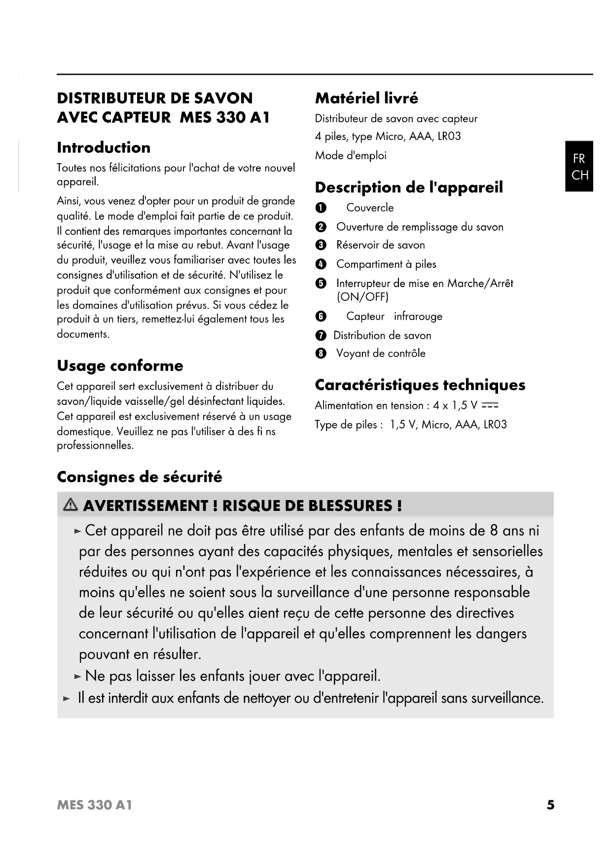 Introduction Toutes nos félicitations pour l'achat de votre nouvel appareil. Ainsi, vous venez d'opter pour un produit de grande qualité. Le mode d'emploi fait partie de ce produit. Il contient des remarques importantes concernant la sécurité, l'usage et la mise au rebut. Avant l'usage du produit, veuillez vous familiariser avec toutes les consignes d'utilisation et de sécurité. N'utilisez le produit que conformément aux consignes et pour les domaines d'utilisation prévus. Si vous cédez le produit à un tiers, remettez-lui également tous les documents. Usage conforme Cet appareil sert exclusivement à distribuer du savon/liquide vaisselle/gel désinfectant liquides. Cet appareil est exclusivement réservé à un usage domestique. Veuillez ne pas l'utiliser à des fi ns professionnelles. Matériel livré Distributeur de savon avec capteur 4 piles, type Micro, AAA, LR03 Mode d'emploi Description de l'appareil 1 Couvercle 2 Ouverture de remplissage du savon 3 Réservoir de savon 4 Compartiment à piles 5 Interrupteur de mise en Marche/Arrêt (ON/OFF) 6 Capteur infrarouge 7 Distribution de savon 8 Voyant de contrôle Caractéristiques techniques Alimentation en tension: 4 x 1,5 V Type de piles : 1,5 V, Micro, AAA, LR03 Consignes de sécurité AVERTISSEMENT! RISQUE DE BLESSURES! ► Cet appareil ne doit pas être utilisé par des enfants de moins de 8 ans ni par des personnes ayant des capacités physiques, mentales et sensorielles réduites ou qui n'ont pas l'expérience et les connaissances nécessaires, à moins qu'elles ne soient sous la surveillance d'une personne responsable de leur sécurité ou qu'elles aient reçu de cette personne des directives concernant l'utilisation de l'appareil et qu'elles comprennent les dangers pouvant en résulter. ► Ne pas laisser les enfants jouer avec l'appareil. ► Il est interdit aux enfants de nettoyer ou d'entretenir l'appareil sans surveillance. IB_90846_MES330A1_LB1.indb 5IB_90846_MES330A1_LB1.indb 5 10.12.13 09:3010.12.13 09:30 148 mm x 200 mm6 MES 330 A1