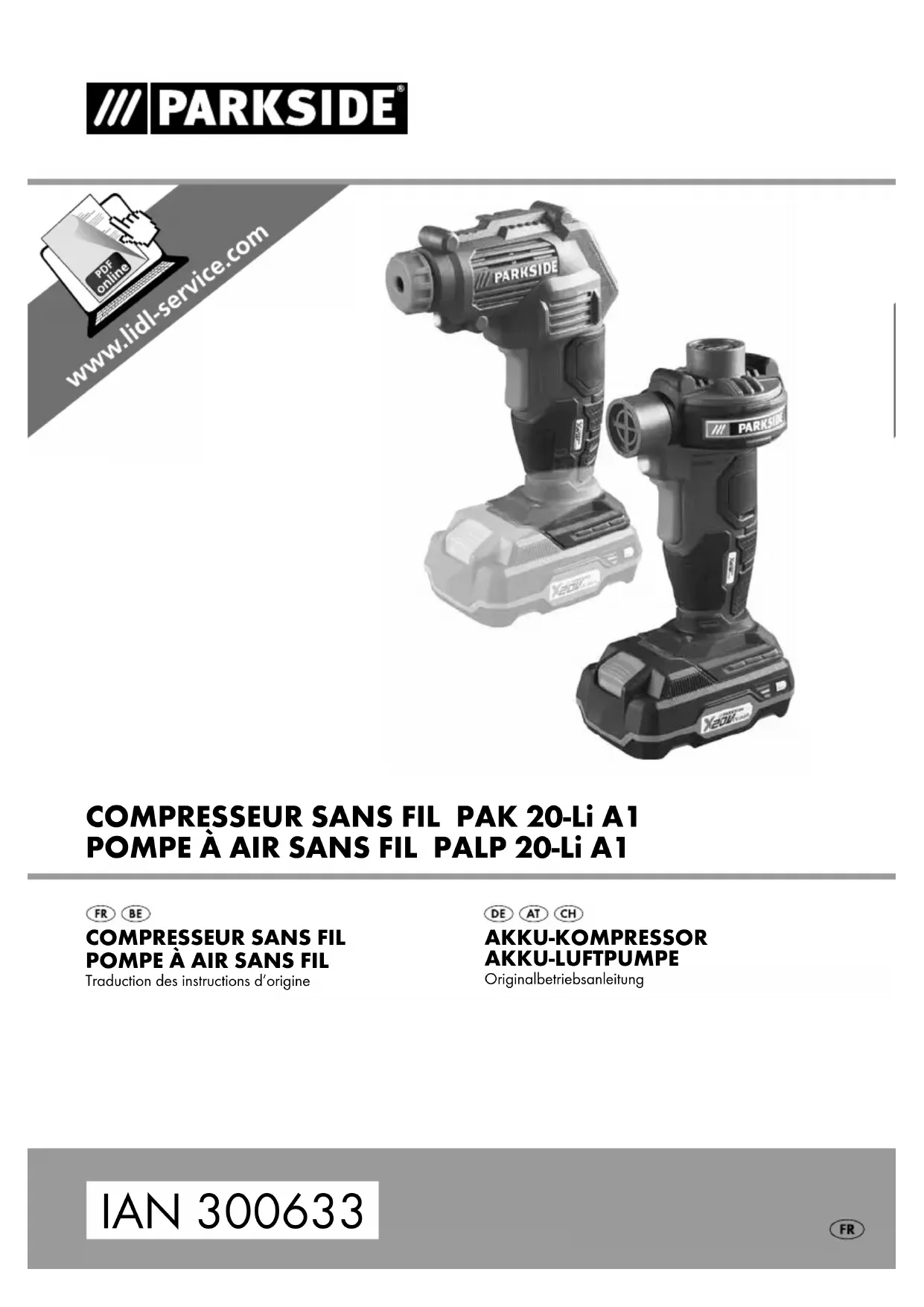 - La seule responsabilité pour l'établissement de cette déclaration de conformité incombe au fabricant. L'objet de la déclaration décrit ci-dessus répond aux prescriptions de la directive 2011/65/EU du Parlement européen et du Conseil en date du 8juin 2011 visant la restriction de l'utilisation de certaines substances dangereuses dans les appareils électriques et électroniques. Normes harmonisées appliquées: EN 60745-1:2009/A11:2010 EN 1012-1:2010 EN 60335-1:2012/A13:2017 EN 60335-2-29:2004/A2:2010 EN 62233:2008 EN 55014-1:2017 EN 55014-2:2015 EN 61000-3-2:2014 EN 61000-3-3:2013 EN 50581:2012 Désignation du modèle de la machine: Compresseur sans fil PAK 20-Li A1 / Pompe à air sans fil PALP 20-Li A1 Année de fabrication: 08 - 2018 Numéro de série: IAN 300633 Bochum, le 07/08/2018 Semi Uguzlu -Responsable qualité- Sous réserve de modifications techniques à des fins de perfectionnement.PAK 20-Li A1 / PALP 20-Li A1 FR│BE │ 15 ■ Commande d’accu de rechange Si vous souhaitez commander un accu de rechange pour votre appareil, vous pouvez le faire très aisément soit sur le site www.kompernass.com soit par téléphone. En raison d’un stock limité, il est possible que cet article soit épuisé très rapidement. REMARQUE ► Dans certains pays, la commande de pièces détachées ne peut pas être réalisée en ligne. Dans ce cas, veuillez contacter la hotline du service après-vente. ■ Cette promotion est limitée à un accu par client / appareil, ainsi qu’à une durée de deux mois après la période promotionnelle. L’accu de rechange peut ensuite être commandé à d’autres conditions. Commande téléphonique Service France Tel.: 0800 919270 E-Mail: kompernass@lidl.fr Service Belgique Tel.: 070 270 171 (0,15 EUR/Min.) E-Mail: kompernass@lidl.be Pour que votre commande soit traitée plus rapidement, veuillez s.v.p. tenir prêt le numéro de référence de l’appareil (par ex. IAN 300633) pour répondre à toute demande de renseignements. Vous trouverez le numéro de référence sur la plaque signalétique ou sur la page de garde de ce mode d’emploi.PAK 20-Li A1 / PALP 20-Li A1 ■ 16 │ FR│BEPAK 20-Li A1 / PALP 20-Li A1