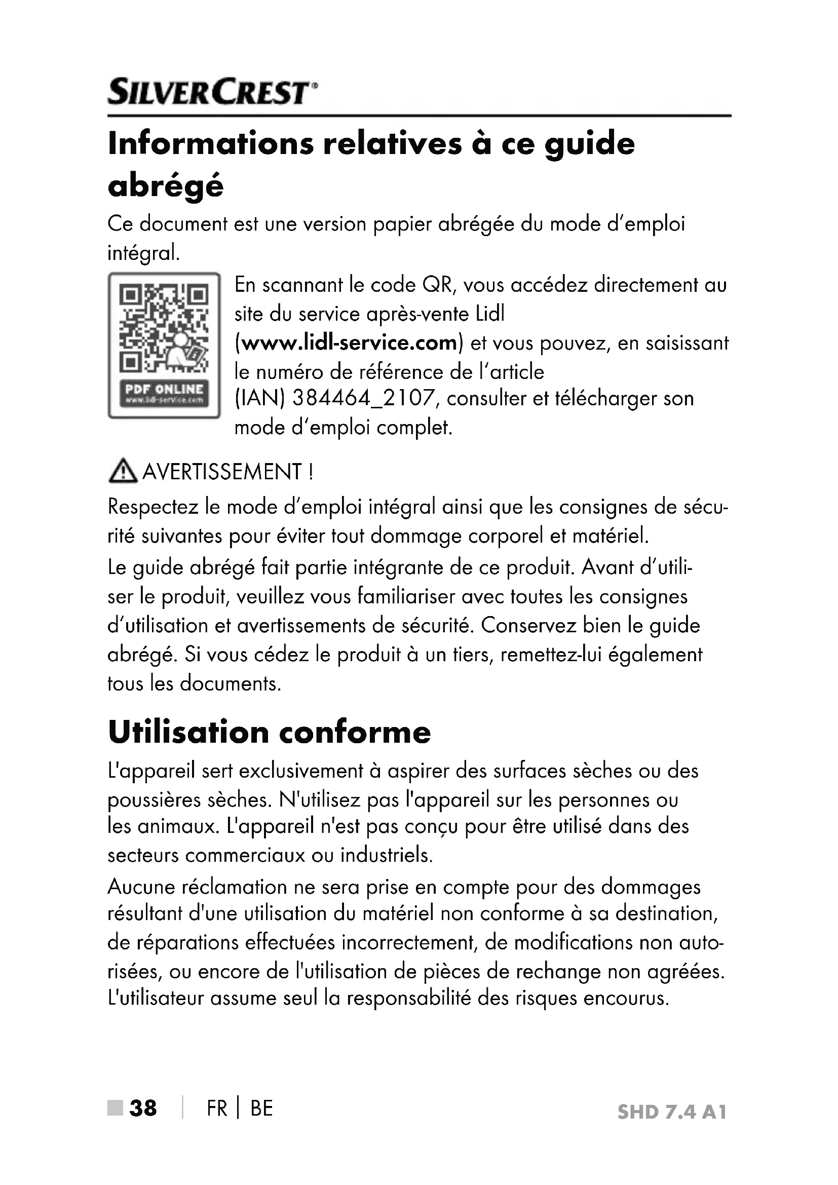 Informations relatives à ce guide abrégé Ce document est une version papier abrégée du mode d’emploi intégral. En scannant le code QR, vous accédez directement au site du service après-vente Lidl (www.lidl-service.com) et vous pouvez, en saisissant le numéro de référence de l‘article (IAN) 384464_2107, consulter et télécharger son mode d‘emploi complet. AVERTISSEMENT ! Respectez le mode d’emploi intégral ainsi que les consignes de sécu- rité suivantes pour éviter tout dommage corporel et matériel. Le guide abrégé fait partie intégrante de ce produit. Avant d’utili- ser le produit, veuillez vous familiariser avec toutes les consignes d’utilisation et avertissements de sécurité. Conservez bien le guide abrégé. Si vous cédez le produit à un tiers, remettez-lui également tous les documents. Utilisation conforme L'appareil sert exclusivement à aspirer des surfaces sèches ou des poussières sèches. N'utilisez pas l'appareil sur les personnes ou les animaux. L'appareil n'est pas conçu pour être utilisé dans des secteurs commerciaux ou industriels. Aucune réclamation ne sera prise en compte pour des dommages résultant d'une utilisation du matériel non conforme à sa destination, de réparations effectuées incorrectement, de modifications non auto- risées, ou encore de l'utilisation de pièces de rechange non agréées. L'utilisateur assume seul la responsabilité des risques encourus.SHD 7.4 A1