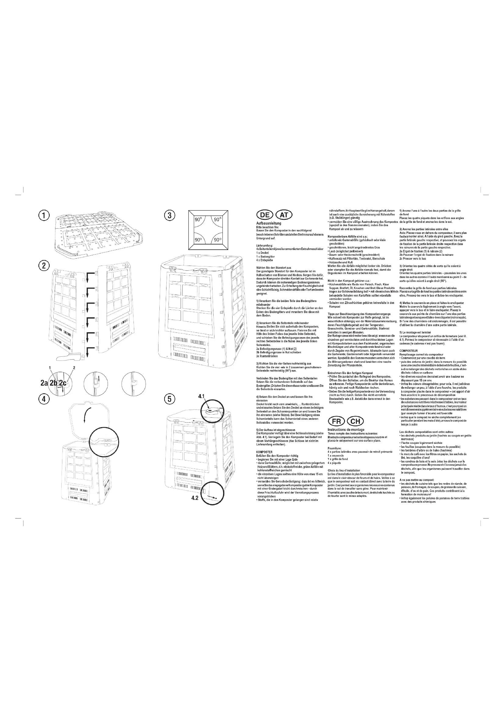 - Sieben Sie die fertige Komposterde vor der Verwendung (nicht zu fein) durch. Geben Sie nicht verrottete Bestandteile wie z.B. Aststücke dann erneut in den Komposter. es et placez-le uniquement sur une surface plane.4 x parties latérales avec poussoir de retrait prémonté1 x couvercle1 x grille de fond4 x piquetsLe lieu d’installation le plus favorable pour le composteur est dans le clair-obscur de eurs et de haies. Veillez à ce que le composteur soit en contact direct avec la terre du jardin. Ceci permet aux organismes nécessaires contenus dans le sol de travailler sans gêne. Pour maintenir l’humidité, une couche de bois mort, de déchets hachés ou de tourbe sont le mieux adaptés. monter ainsi. A l’aide du pied gauche, xez la partie latérale gauche respective, et poussez les ergots de xation de la partie latérale droite respective dans les rainures de la partie gauche respective.2a Ergot de xation (1) & rainure (2)2b Pousser l’ergot de xation dans la rainure2c Presser vers le bas Orientez les quatre parties latérales – poussées les unesdans les autres comme il l’a été mentionné au point 2 – desorte qu’elles soient à angle droit (90°).Placez sur la grille de fond les parties latérales reliées entreelles. Pressez-les vers le bas et faites-les encliqueter.Mettre le couvercle légèrement à angle vers l’avant, appuyer vers le bas et le faire encliqueter. Placez le couvercle aux points de charnière sur l’une des parties latérales quelconques et faites-le encliqueter (voir croquis). Si l’une des charnières est endommagée, il est possible d’utiliser la charnière d’une autre partie latérale. Le composteur dispose d’un orice de fermeture (voir ill. 4.1). Fermez le composteur si nécessaire à l’aide d’un cadenas (le cadenas n’est pas fourni).• Commencez par une couche de terre• puis des ordures de jardin; dans la mesure du possible avec une couche intermédiaire de bois et de feuilles, c’est- à-dire mélanger des déchets verts riches en azote et des déchets riches en carbone• les diverses couches devraient avoir une hauteur ne dépassant pas 15 cm env.• évitez les odeurs désagréables; pour cela, il est judicieux de mélanger un peu, à l’aide d’une fourche, les produits à composter placés dans le composteur – cet apport d’air frais accélère le processus de décomposition