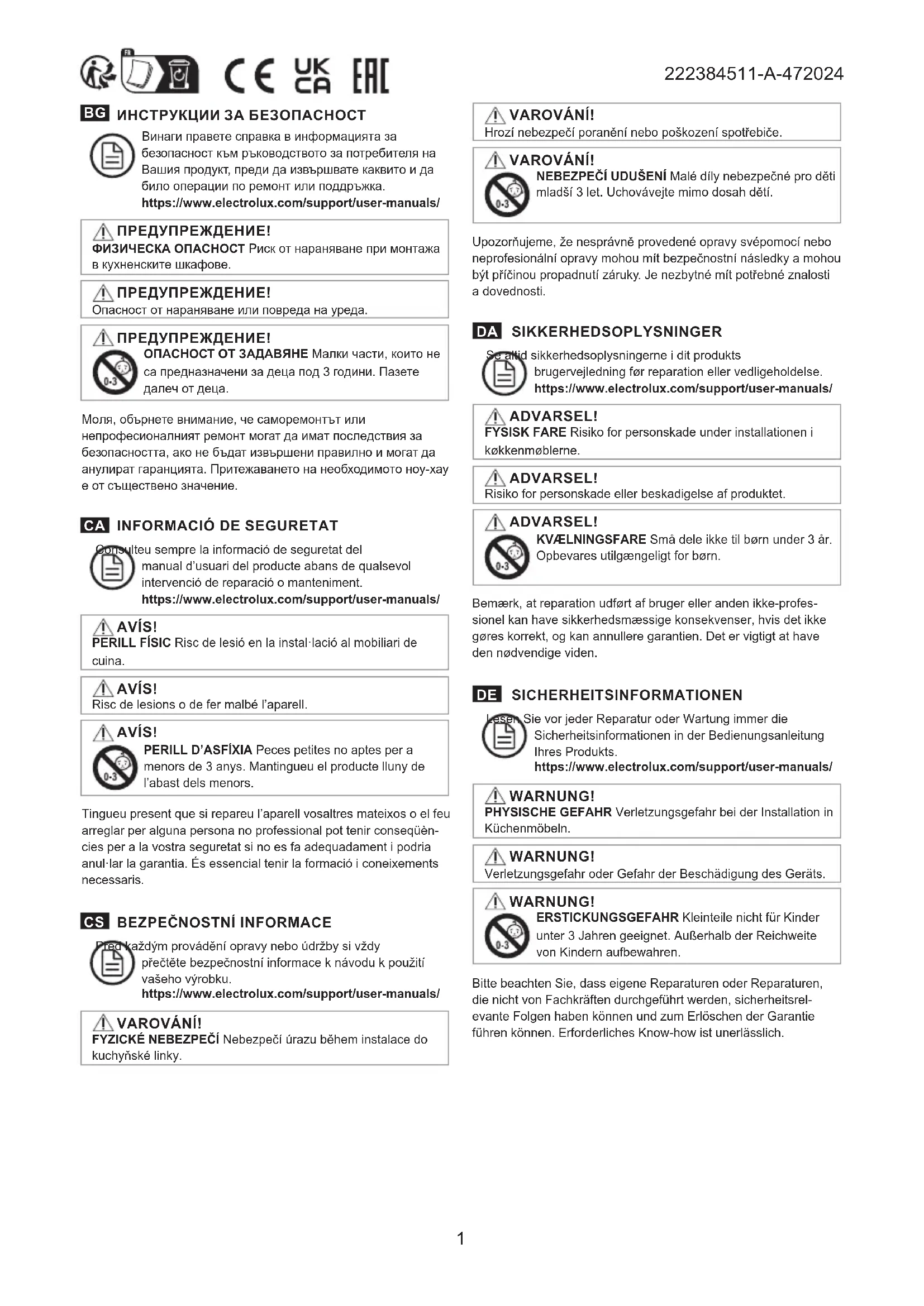 Reportez-vous toujours aux informations de sécurité du manuel d’utilisation de votre produit avant toute opération de réparation ou de maintenance. https://www.electrolux.com/support/user-manuals/ AVERTISSEMENT ! DANGER PHYSIQUE Risque de blessure lors de l’installation dans le mobilier de cuisine. AVERTISSEMENT ! Risque de blessure ou de dommages matériels. AVERTISSEMENT ! RISQUE D’ÉTOUFFEMENT Les petites pièces ne sont pas destinées aux enfants de moins de 3 ans. Tenir hors de la portée des enfants. Veuillez noter qu’une autoréparation ou une réparation non profes- sionnelle peuvent avoir des conséquences sur la sécurité si elle n’est pas eff ectuée correctement, et peut annuler la garantie. Il est essentiel de posséder le savoir-faire nécessaire.3