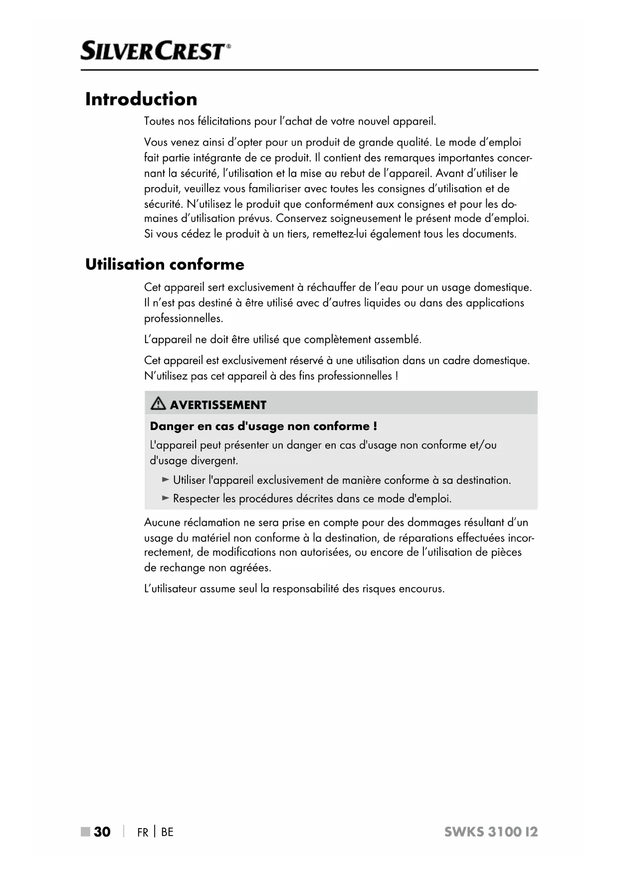 Introduction Toutes nos félicitations pour l’achat de votre nouvel appareil. Vous venez ainsi d’opter pour un produit de grande qualité. Le mode d’emploi fait partie intégrante de ce produit. Il contient des remarques importantes concer- nant la sécurité, l’utilisation et la mise au rebut de l’appareil. Avant d’utiliser le produit, veuillez vous familiariser avec toutes les consignes d’utilisation et de sécurité. N’utilisez le produit que conformément aux consignes et pour les do- maines d’utilisation prévus. Conservez soigneusement le présent mode d’emploi. Si vous cédez le produit à un tiers, remettez-lui également tous les documents. Utilisation conforme Cet appareil sert exclusivement à réchauffer de l’eau pour un usage domestique. Il n’est pas destiné à être utilisé avec d’autres liquides ou dans des applications professionnelles. L’appareil ne doit être utilisé que complètement assemblé. Cet appareil est exclusivement réservé à une utilisation dans un cadre domestique. N’utilisez pas cet appareil à des fins professionnelles ! AVERTISSEMENT Danger en cas d'usage non conforme ! L'appareil peut présenter un danger en cas d'usage non conforme et/ou d'usage divergent. ► Utiliser l'appareil exclusivement de manière conforme à sa destination. ► Respecter les procédures décrites dans ce mode d'emploi. Aucune réclamation ne sera prise en compte pour des dommages résultant d’un usage du matériel non conforme à la destination, de réparations effectuées incor- rectement, de modifications non autorisées, ou encore de l’utilisation de pièces de rechange non agréées. L’utilisateur assume seul la responsabilité des risques encourus.SWKS 3100 I2