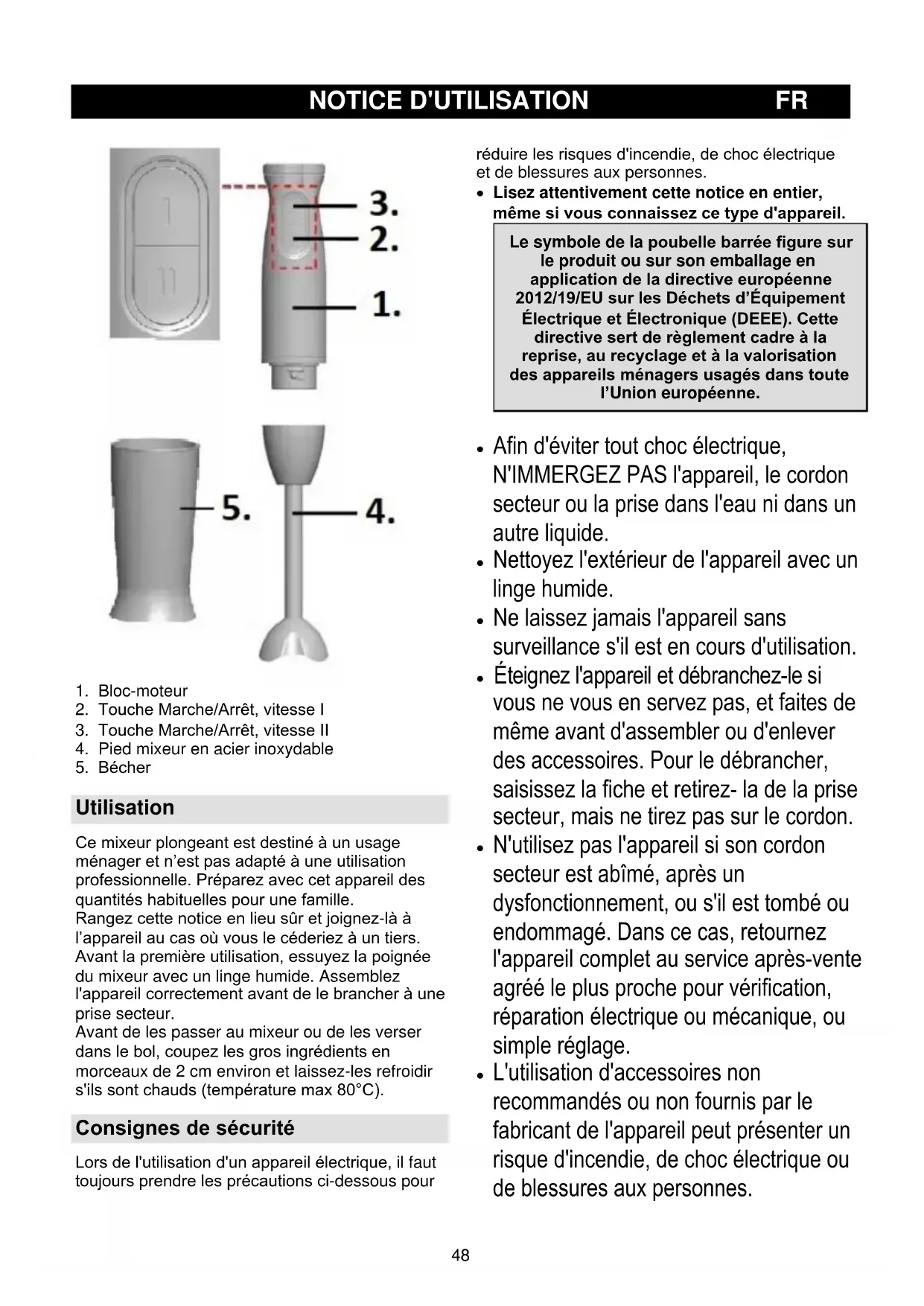 Utilisation Ce mixeur plongeant est destiné à un usage ménager et n’est pas adapté à une utilisation professionnelle. Préparez avec cet appareil des quantités habituelles pour une famille. Rangez cette notice en lieu sûr et joignez-là à l’appareil au cas où vous le céderiez à un tiers. Avant la première utilisation, essuyez la poignée du mixeur avec un linge humide. Assemblez l'appareil correctement avant de le brancher à une prise secteur. Avant de les passer au mixeur ou de les verser dans le bol, coupez les gros ingrédients en morceaux de 2 cm environ et laissez-les refroidir s'ils sont chauds (température max 80°C). Consignes de sécurité Lors de l'utilisation d'un appareil électrique, il faut toujours prendre les précautions ci-dessous pour réduire les risques d'incendie, de choc électrique et de blessures aux personnes.