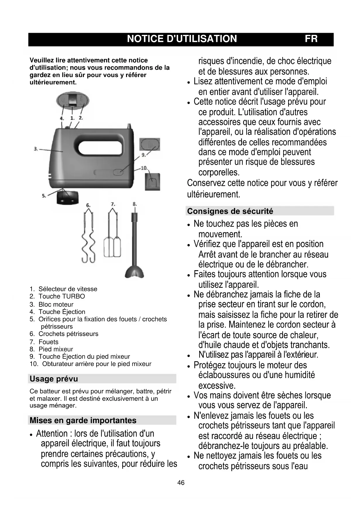 Usage prévu Ce batteur est prévu pour mélanger, battre, pétrir et malaxer. Il est destiné exclusivement à un usage ménager. Mises en garde importantes