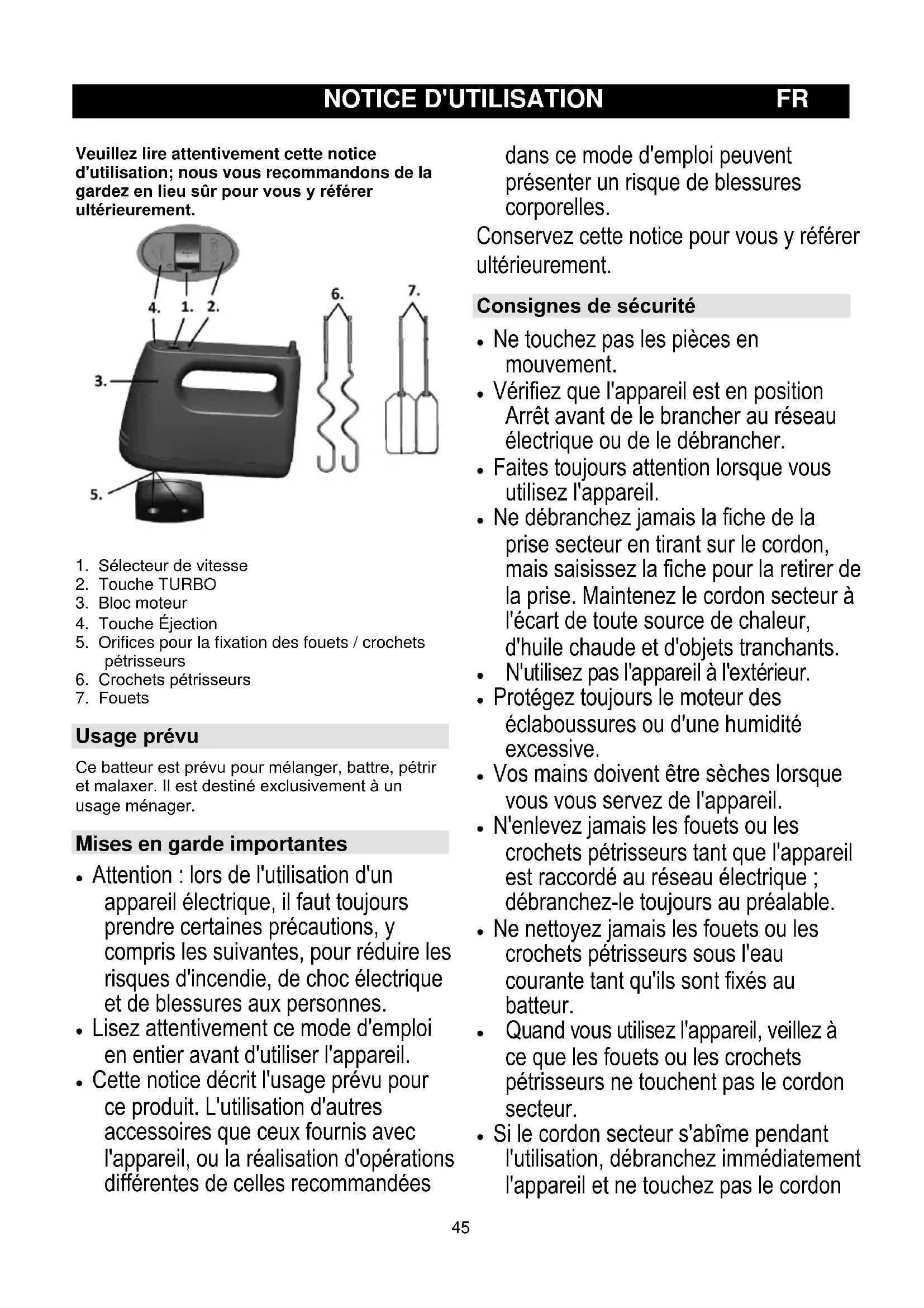 Usage prévu Ce batteur est prévu pour mélanger, battre, pétrir et malaxer. Il est destiné exclusivement à un usage ménager. Mises en garde importantes