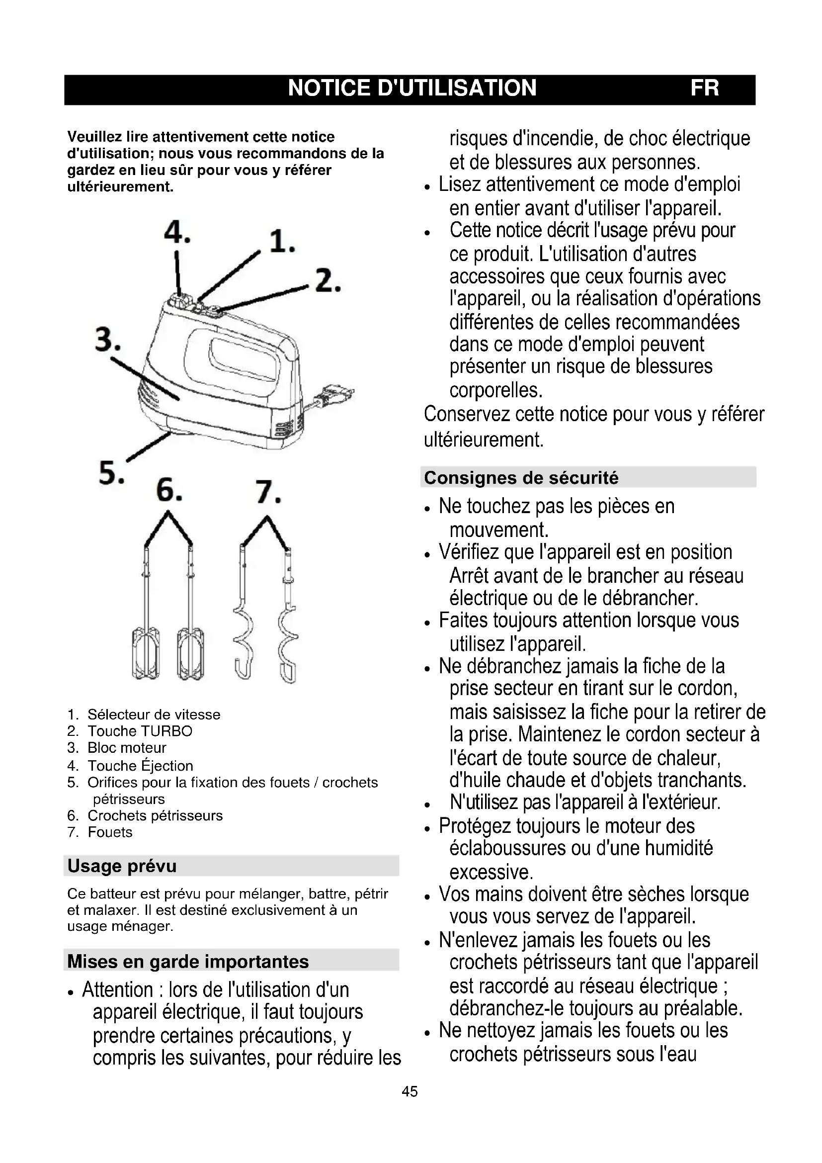 Usage prévu Ce batteur est prévu pour mélanger, battre, pétrir et malaxer. Il est destiné exclusivement à un usage ménager. Mises en garde importantes
