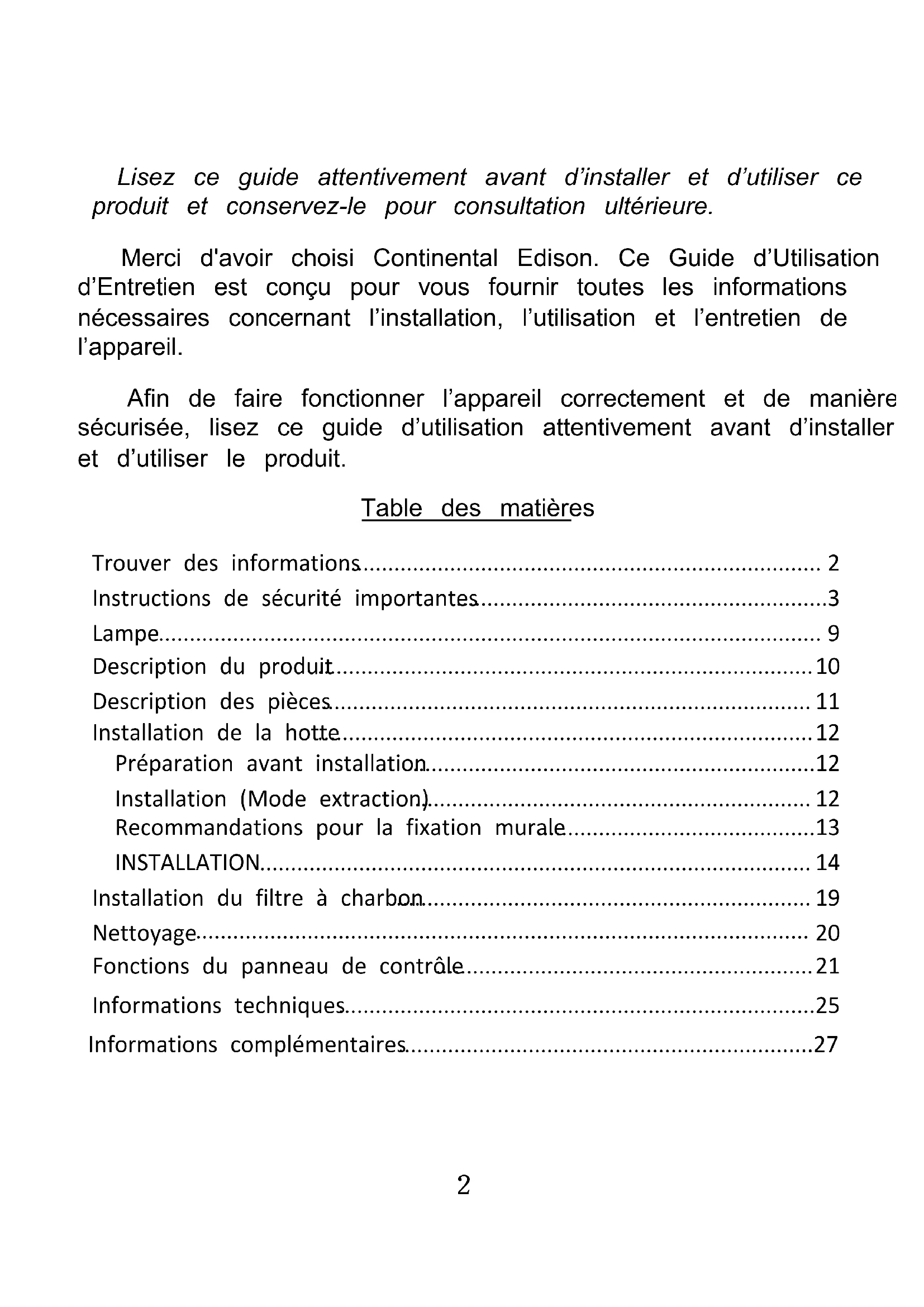 Hotte Décorative - Wall Mounted Hood & Hotte-Vertical Range Hood Guide d’utilisation - User manual2 Lisez ce guide attentivement avant d’installer et d’utiliser ce produit et conservez-le pour consultation ultérieure. Merci d'avoir choisi Continental Edison. Ce Guide d’Utilisation et d’Entretien est conçu pour vous fournir toutes les informations nécessaires concernant l’installation, l’utilisation et l’entretien de l’appareil. Afin de faire fonctionner l’appareil correctement et de manière sécurisée, lisez ce guide d’utilisation attentivement avant d’installer et d’utiliser le produit. Table des matières Trouver des informations