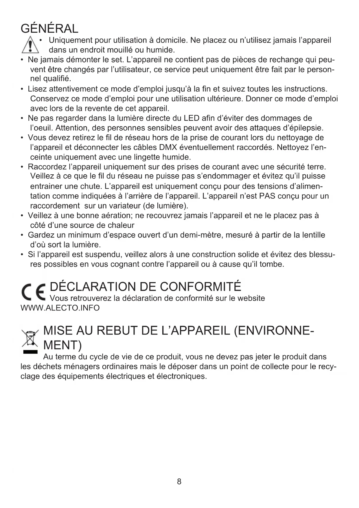 MISE AU REBUT DE L’APPAREIL (ENVIRONNE- MENT) Au terme du cycle de vie de ce produit, vous ne devez pas jeter le produit dans les déchets ménagers ordinaires mais le déposer dans un point de collecte pour le recy- clage des équipements électriques et électroniques.9 UTILISER Utilisation destinée : Le LE-180 est uniquement conçu pour présenter des effets de lumière LED dans une environnement privé. Le LE-180 n’est pas conçu pour une application industrielle. Sommaire :