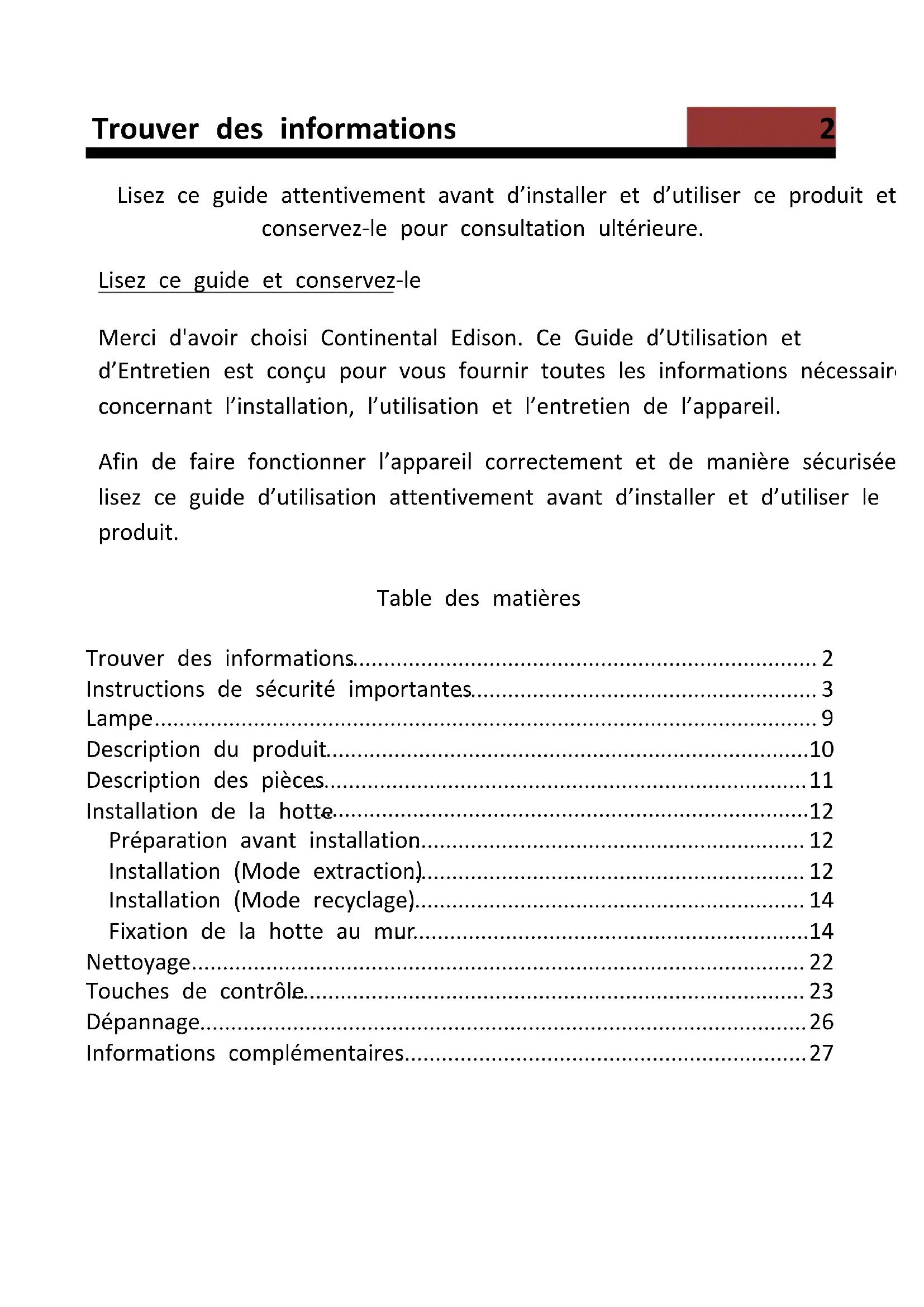 Lisez ce guide attentivement avant d’installer et d’utiliser ce produit et conservez-le pour consultation ultérieure. Lisez ce guide et conservez-le Merci d'avoir choisi Continental Edison. Ce Guide d’Utilisation et d’Entretien est conçu pour vous fournir toutes les informations nécessaires concernant l’installation, l’utilisation et l’entretien de l’appareil. Afin de faire fonctionner l’appareil correctement et de manière sécurisée, lisez ce guide d’utilisation attentivement avant d’installer et d’utiliser le produit. Table des matières Trouver des informations