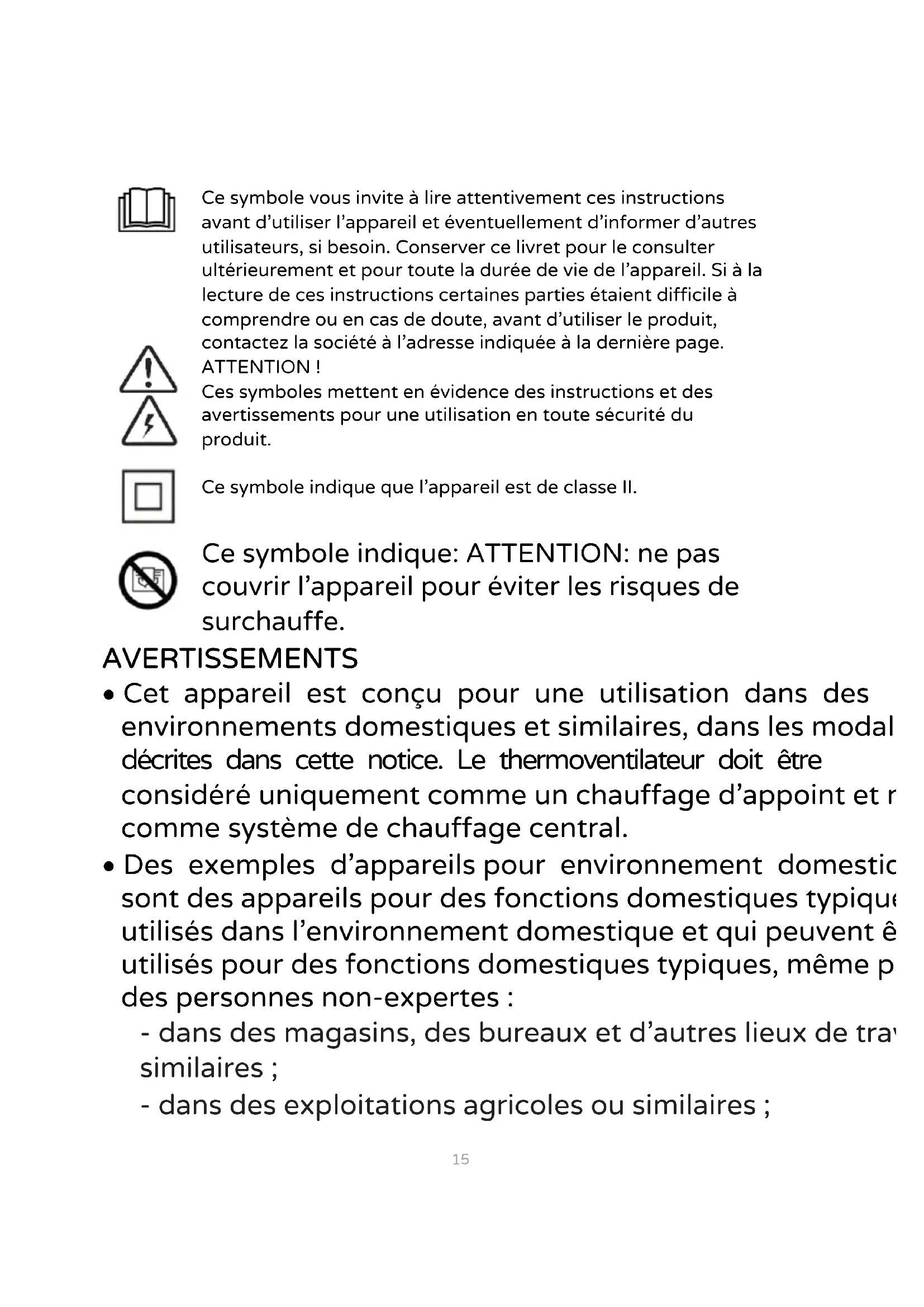 Ce symbole vous invite à lire attentivement ces instructions avant d'utiliser l'appareil et éventuellement d’informer d’autres utilisateurs, si besoin. Conserver ce livret pour le consulter ultérieurement et pour toute la durée de vie de l'appareil. Si à la lecture de ces instructions certaines parties étaient difficile à comprendre ou en cas de doute, avant d'utiliser le produit, contactez la société à l'adresse indiquée à la dernière page. ATTENTION ! Ces symboles mettent en évidence des instructions et des avertissements pour une utilisation en toute sécurité du produit. Ce symbole indique que l'appareil est de classe II. Ce symbole indique: ATTENTION: ne pas couvrir l'appareil pour éviter les risques de surchauffe.16 - par des clients dans des hôtels, motels et autres environnements de type résidentiel ; - dans des établissements tels des bed & breakfast. L’appareil ne doit pas être utilisé dans des environnements poussiéreux ou en présence de matériaux extrêmement volatils (cela pourrait bloquer les grilles), dans des environnements humides, près de produits inflammables, ou à l'extérieur (en plein air). Toute autre utilisation est considérée comme impropre et dangereuse. Le fabricant ne pourra pas être tenu responsable de tout dommage causé par une utilisation impropre, erronée et irresponsable et/ou par des réparations effectuées par du personnel non qualifié. Quand le thermoventilateur est en marche il se réchauffe. Donc, ne toucher que la poignée et les molettes en plastique. Éviter le contact avec la grille frontale car elle peut être très chaude. Ne pas introduire les doigts et/ou des objets à travers la grille frontale afin d'éviter des égratignures, des secousses électriques ou des dommages à l'appareil. La grille de protection n'assure pas une protection complète des enfants ou des personnes à capacités physiques, sensorielles ou mentales réduites. ATTENTION : - Certaines parties du produit peuvent devenir très chaudes et provoquer des brûlures. Soyez spécialement vigilants en présence d'enfants ou de personnes vulnérables. - lors de l'utilisation d'appareils électriques, toujours respecter les précautions de sécurité pour éviter tout risque d'incendie, de choc électrique ou de blessure.17 - Ne pas utiliser cet appareil dans une chambre dont l'aire de base est inférieure à 4m². Cet appareil peut être utilisé par des enfants d'au moins 8 ans et par des personnes ayant un handicap physique, sensoriel ou mental ou avec un manque d'expérience et de connaissances, si elles sont surveillées ou si elles ont reçu les informations nécessaires pour une utilisation en toute sécurité de l’appareil et qu'elles sont conscientes des dangers potentiels. Les enfants ne doivent pas jouer avec l'appareil. Les enfants ne doivent pas effectuer les opérations d'entretien et de nettoyage sans surveillance. Les enfants de moins de 3 ans doivent être tenus à distance de l'appareil s'ils ne sont pas surveillés. Les enfants de 3 à 8 ans doivent se limiter à allumer / éteindre l'appareil, à condition qu'il soit placé ou installé dans sa position de fonctionnement normale et qu'ils reçoivent la surveillance ou les instructions nécessaires à son utilisation, et qu'ils comprennent les dangers liés à l'appareil. Les enfants de 3 à 8 ans ne doivent pas brancher, régler ou nettoyer l'appareil, ni en effectuer l'entretien. Veiller à ce que le thermoventialateur ne rentre pas en contact avec de l'eau ni avec d'autres liquides. Si le thermoconvecteur devait par inadvertance se mouiller ou être immergée dans un liquide, désactiver d'abord la prise de courant en éteignant l'interrupteur depuis le tableau électrique, et débrancher ensuite la fiche. Sécher soigneusement et la fiche et la prise de courant, et ensuite réactiver le courant sur la prise. Réinsérer la fiche dans la prise de courant, et utiliser ensuite l'appareil . En cas de doute, consulter un technicien qualifié.18