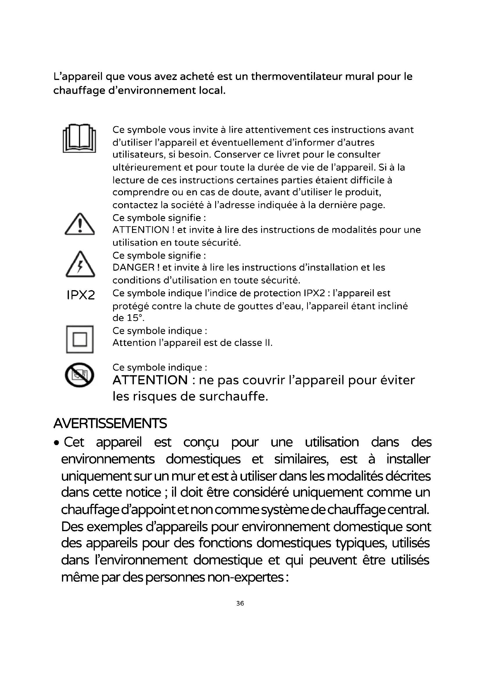 Ce symbole vous invite à lire attentivement ces instructions avant d'utiliser l'appareil et éventuellement d’informer d’autres utilisateurs, si besoin. Conserver ce livret pour le consulter ultérieurement et pour toute la durée de vie de l'appareil. Si à la lecture de ces instructions certaines parties étaient difficile à comprendre ou en cas de doute, avant d'utiliser le produit, contactez la société à l'adresse indiquée à la dernière page. Ce symbole signifie : ATTENTION ! et invite à lire des instructions de modalités pour une utilisation en toute sécurité. Ce symbole signifie : DANGER ! et invite à lire les instructions d'installation et les conditions d'utilisation en toute sécurité. IPX2