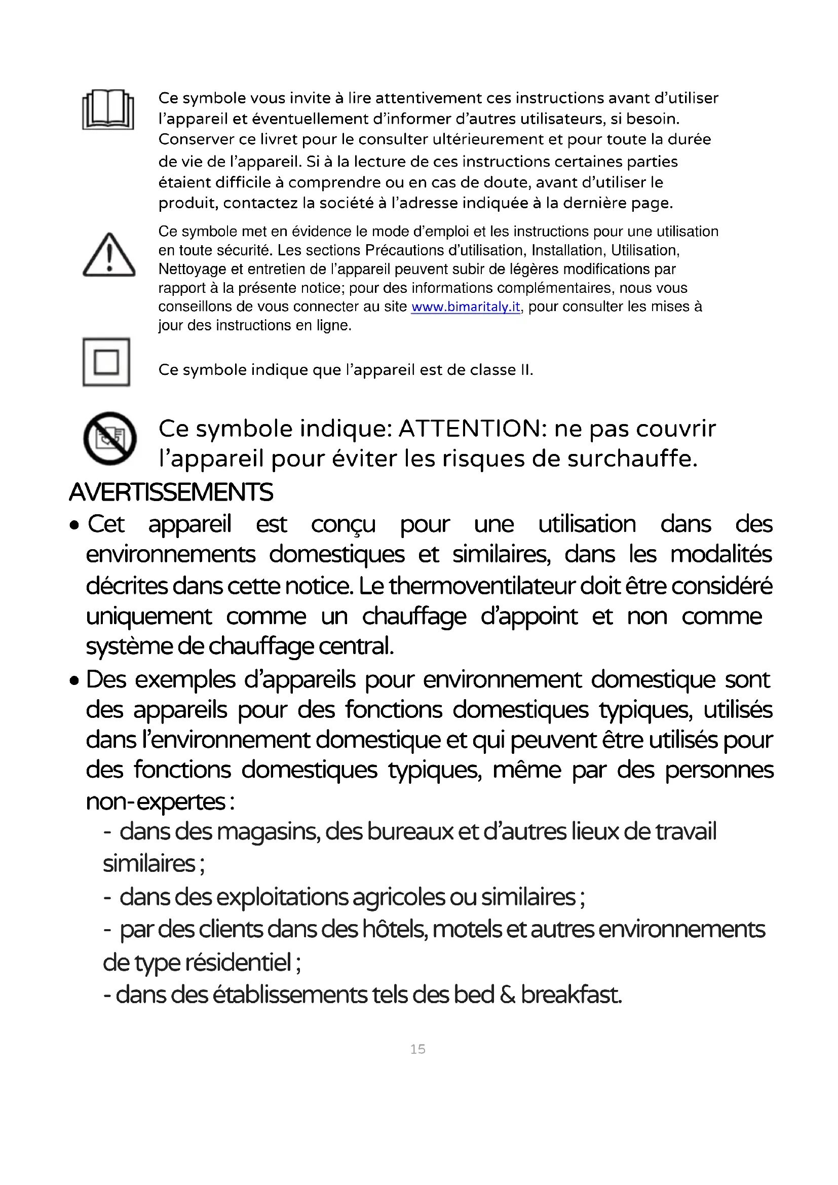 Ce symbole vous invite à lire attentivement ces instructions avant d'utiliser l'appareil et éventuellement d’informer d’autres utilisateurs, si besoin. Conserver ce livret pour le consulter ultérieurement et pour toute la durée de vie de l'appareil. Si à la lecture de ces instructions certaines parties étaient difficile à comprendre ou en cas de doute, avant d'utiliser le produit, contactez la société à l'adresse indiquée à la dernière page. Ce symbole met en évidence le mode d’emploi et les instructions pour une utilisation en toute sécurité. Les sections Précautions d’utilisation, Installation, Utilisation, Nettoyage et entretien de l’appareil peuvent subir de légères modifications par rapport à la présente notice; pour des informations complémentaires, nous vous conseillons de vous connecter au site www.bimaritaly.it, pour consulter les mises à jour des instructions en ligne. Ce symbole indique que l'appareil est de classe II. Ce symbole indique: