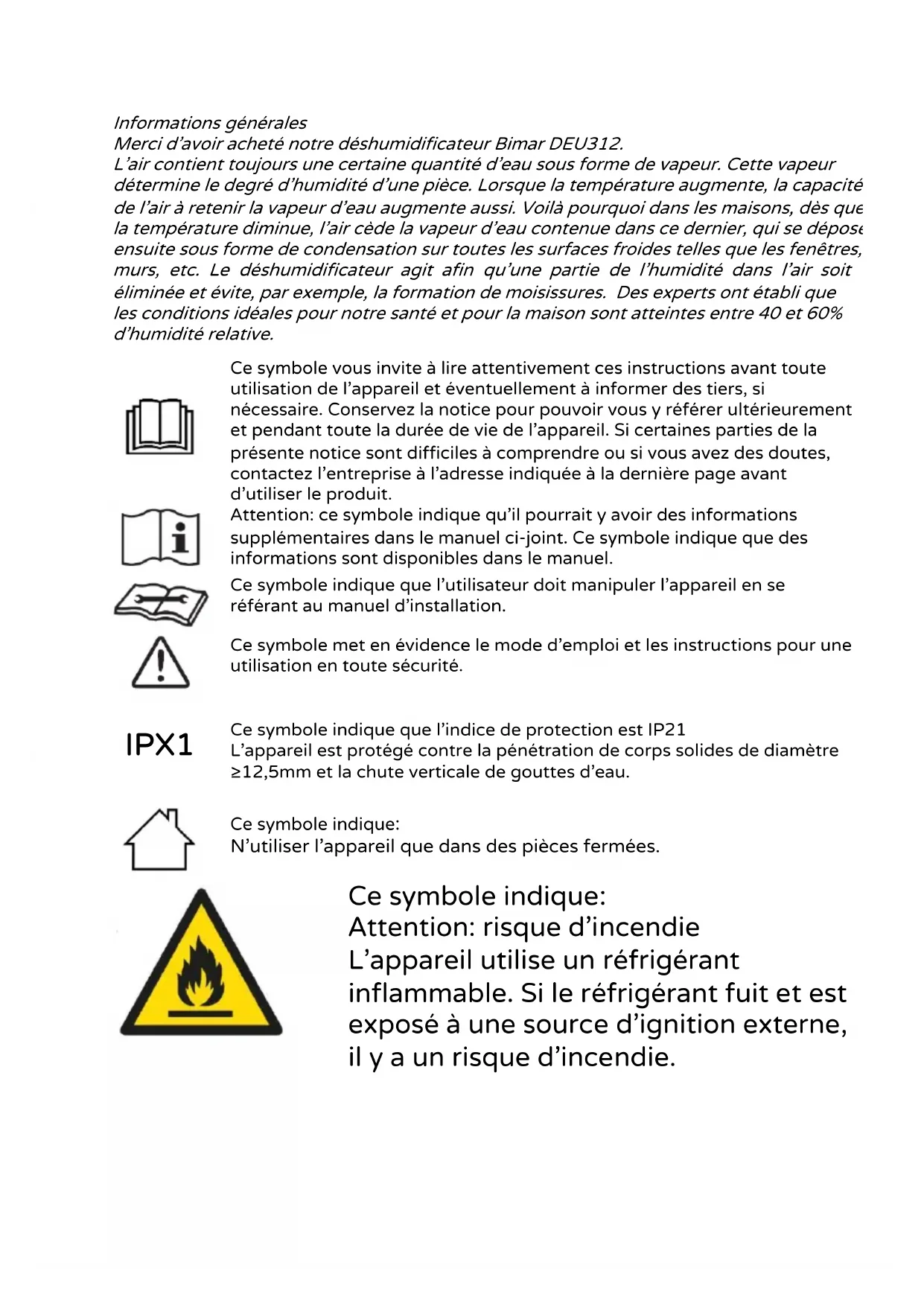 Ce symbole indique: Attention: risque d’incendie L’appareil utilise un réfrigérant inflammable. Si le réfrigérant fuit et est exposé à une source d’ignition externe, il y a un risque d’incendie.INSTRUCTIONS GÉNÉRALES Cet appareil est destiné exclusivement à l’usage domestique (et donc non professionnel), pour déshumidifier, c’est-à-dire pour réduire le pourcentage d’humidité relative de l’air dans des pièces intérieures, selon les modalités indiquées dans le présent manuel. Ne pas utiliser l’appareil dans des pièces particulièrement poussiéreuses ou en présence de matériaux extrêmement volatiles qui pourraient obstruer le filtre ou endommager le moteur, ni à l’extérieur. Les appareils destinés à un usage domestique sont des appareils aux fonctions domestiques typiques, utilisés dans un cadre domestique, qui peuvent être utilisés pour des fonctions domestiques typiques également par des personnes non expertes: - dans des magasins, bureaux et autres lieux de travail similaires; - dans des exploitations agricoles ou similaires; - par les clients des hôtels, motels et autres environnements à caractère résidentiel; - dans des environnements de type chambres d’hôtes. L’appareil a été conçu pour fonctionner à une température comprise entre 5°C et 32°C. Utiliser le déshumidificateur seulement si tous ses éléments sont insérés de manière correcte. Utiliser le déshumidificateur toujours et seulement en position verticale: ne pas s’asseoir ou monter dessus. Attention: quand on utilise des appareils électriques, il faut toujours respecter les précautions inhérentes à la sécurité de base afin d’éviter les risques d’incendie, de chocs électriques et de lésions physiques. Une attention et des précautions supplémentaires sont nécessaires lors de l’utilisation d’appareilsélectriques comprenant un réservoir avec de l’eau: si l’eau devait déborder ou mouiller le cordon et la prise de courant, désactivez d’abord la prise de courant en éteignant l’interrupteur sur le tableau électrique, puis retirez la fiche de la prise de courant. Essuyez soigneusement aussi bien la fiche que la prise de courant, puis rallumez le courant. En cas de doute, adressez-vous à un professionnel qualifié. Cet appareil peut être utilisé par des enfants âgés d’au moins 8 ans et par des personnes ayant des capacités physiques, sensorielles ou mentales réduites, ou manquant d'expérience ou de connaissances nécessaires, à condition qu'elles soient sous la surveillance d’un adulte ou qu’elles aient reçu des instructions concernant l’utilisation en toute sécurité de l'appareil et aient compris les dangers qui lui sont inhérents. Les enfants ne doivent pas jouer avec l’appareil. Le nettoyage et la maintenance destinés à être effectués par l'utilisateur ne doivent pas être effectués par des enfants laissés sans surveillance. Prenez les précautions qui s’imposent pour empêcher les enfants de jouer avec l'appareil. L’appareil et tous ses accessoires doivent être maintenus hors de portée des enfants. Ne pas obstruer la grille d’aspiration et d’émission de l’air. Ne pas introduire les doigts ou d’objets dans les conduits des grilles d’entrée ou de sortie de l’air. Ne pas toucher l’appareil ou la prise de courant avec les mains et les pieds mouillés. Eviter d’exposer longtemps des parties du corps à l’air sortant de l’appareil afin d’éviter de tomber malade. Si l’appareil n’est pas utilisé, retirer la fiche de la prise de courant. Ne pas déplacer l'appareil pendant le fonctionnement. Ne pas tirer sur le câble d’alimentation ou sur l’appareil pour débrancher la fiche de la prise de courant. Ne pas tirer sur le câble pour déplacer l’appareil. Toujours débrancher l’appareil de la prise de courant avant de monter, démonter et vider le réservoir, et avant de nettoyer le filtre et l’appareil. Si le câble d’alimentation est endommagé, il doit être remplacé par le fabricant ou par son service d’assistance technique ou par une personne ayant une qualification similaire, afin d’éviter tout risque. Cet appareil n’est pas destiné à fonctionner au moyen d’un temporisateur externe ou avec un système de commande à distance indépendant, pour éviter le risque d’incendie au cas où l’appareil soit recouvert ou positionné de manière non correcte. Ne laissez pas l'appareil exposé aux agents atmosphériques (soleil, pluie, etc.). Afin d’éviter tout risque de choc électrique, ne trempez jamais la fiche, le cordon électrique et l’appareil dans l’eau ou dans tout autre liquide. Ne buvez pas ou n’utilisez pas l’eau recueillie dans le réservoir. Toute autre utilisation doit être considérée comme impropre et dangereuse. Le fabricant ne pourra pas être tenu responsable d’éventuels dommages causés par une utilisation impropre, erronée et irresponsable et/ou par des réparations effectuées par un personnel non qualifié.