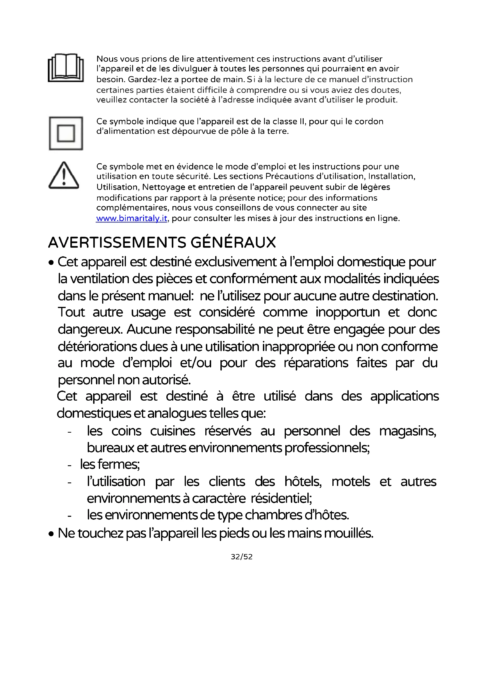 Ce symbole met en évidence le mode d’emploi et les instructions pour une utilisation en toute sécurité. Les sections Précautions d’utilisation, Installation, Utilisation, Nettoyage et entretien de l’appareil peuvent subir de légères modifications par rapport à la présente notice; pour des informations complémentaires, nous vous conseillons de vous connecter au site www.bimaritaly.it, pour consulter les mises à jour des instructions en ligne.