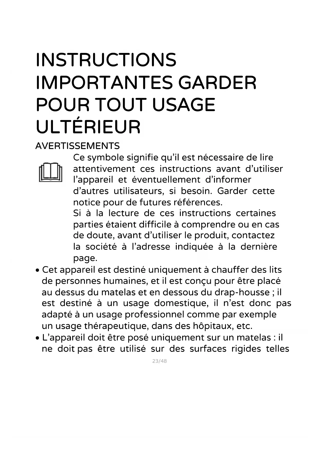 Ce symbole signifie qu'il est nécessaire de lire attentivement ces instructions avant d'utiliser l'appareil et éventuellement d’informer d’autres utilisateurs, si besoin. Garder cette notice pour de futures références. Si à la lecture de ces instructions certaines parties étaient difficile à comprendre ou en cas de doute, avant d'utiliser le produit, contactez la société à l'adresse indiquée à la dernière page. Cet appareil est destiné uniquement à chauffer des lits de personnes humaines, et il est conçu pour être placé au dessus du matelas et en dessous du drap-housse ; il est destiné à un usage domestique, il n'est donc pas adapté à un usage professionnel comme par exemple un usage thérapeutique, dans des hôpitaux, etc. L'appareil doit être posé uniquement sur un matelas : il ne doit pas être utilisé sur des surfaces rigides telles24/48