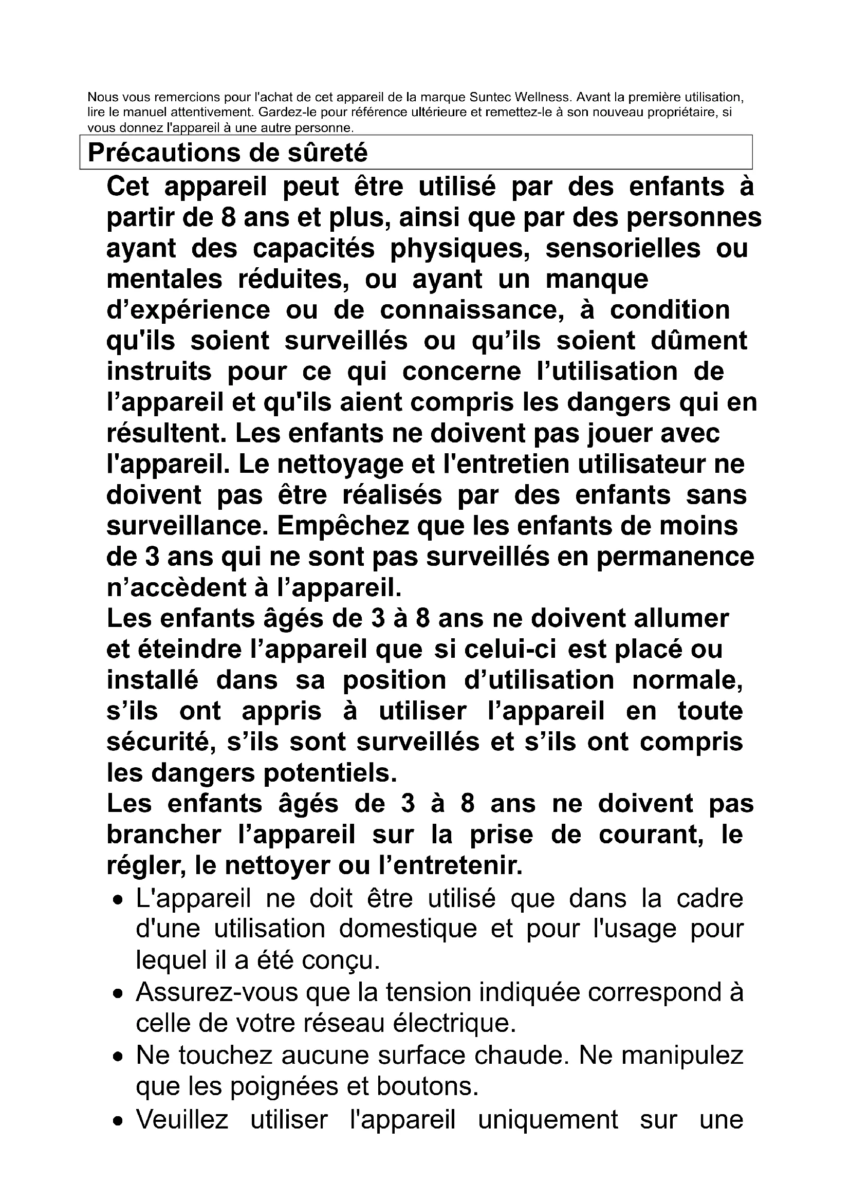 Nous vous remercions pour l'achat de cet appareil de la marque Suntec Wellness. Avant la première utilisation, lisez le manuel attentivement. Gardez-le pour référence ultérieure et remettez-le à son nouveau propriétaire, si vous donnez l'appareil à une autre personne.