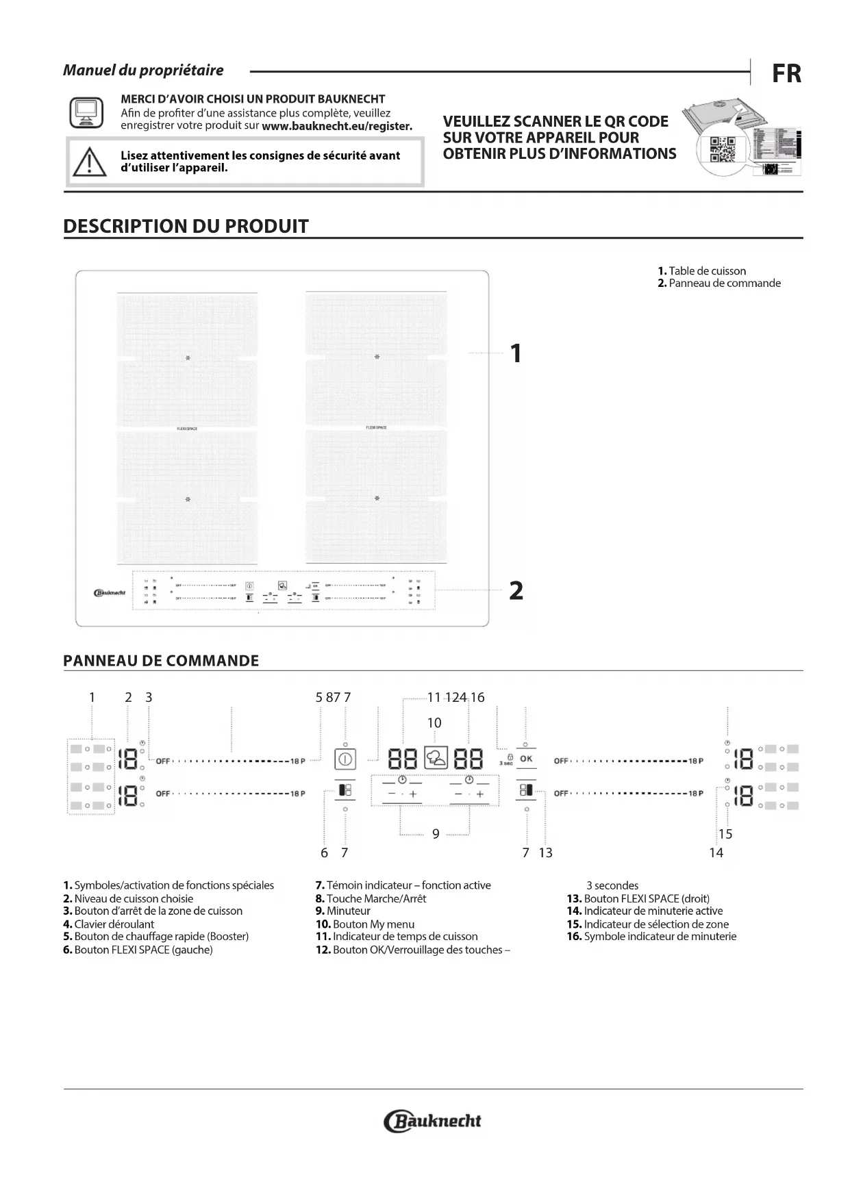 1. Symboles/activation de fonctions spéciales2. Niveau de cuisson choisie3. Bouton d’arrêt de la zone de cuisson4. Clavier déroulant 5. Bouton de chauage rapide (Booster)6. Bouton FLEXI SPACE (gauche)7. Témoin indicateur – fonction active8. Touche Marche/Arrêt9. Minuteur10. Bouton Mymenu11. Indicateur de temps de cuisson12. Bouton OK/Verrouillage des touches – 3secondes13. Bouton FLEXI SPACE (droit)14. Indicateur de minuterie active15. Indicateur de sélection de zone16. Symbole indicateur de minuterie1. Table de cuisson2. Panneau de commande