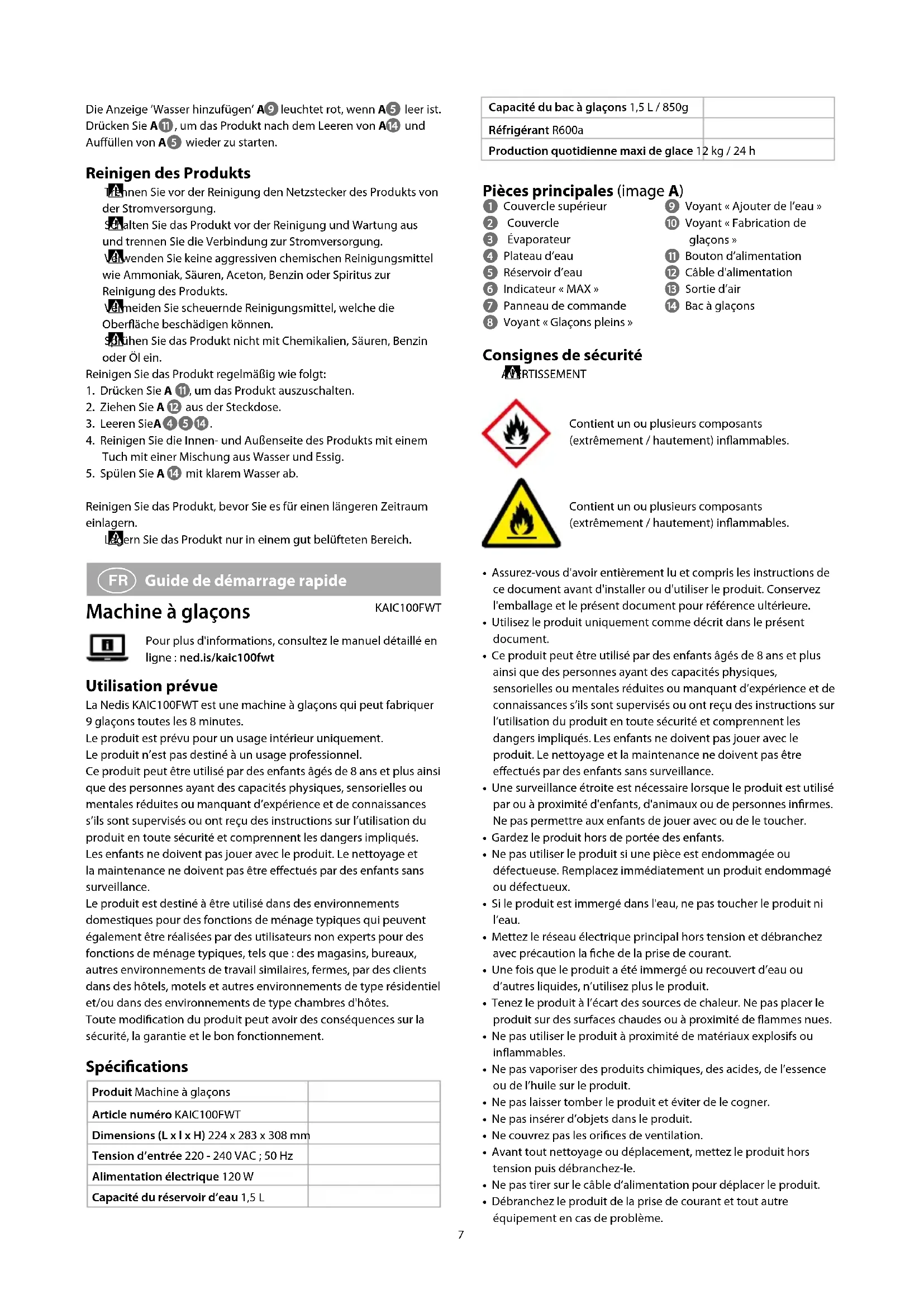 Snelstartgids IJsblokjesmachine KAIC100FWTZie voor meer informatie de uitgebreide handleiding online: ned.is/kaic100fwt Bedoeld gebruik De Nedis KAIC100FWT is een ijsblokjesmachine die elke 8 minuten 9 ijsblokjes kan maken.Het product is enkel bedoeld voor gebruik binnenshuis.Het product is niet bedoeld voor professioneel gebruik.Dit product mag worden gebruikt door kinderen van 8 jaar en ouder en personen met een verminderd lichamelijk, zintuiglijk of geestelijk vermogen, of die gebrek aan ervaring of kennis hebben, als iemand die verantwoordelijk is voor hun veiligheid toezicht op hen houdt of hen is uitgelegd hoe het product veilig dient te worden gebruikt en ze begrijpen wat de potentiële risico's zijn. Kinderen mogen niet met het product spelen. De reiniging en het onderhoud door de gebruiker mogen niet worden uitgevoerd door kinderen zonder toezicht.Het product is bedoeld voor gebruik in huishoudelijke omgevingen voor typische huishoudelijke functies die ook kunnen worden gebruikt door niet-deskundige gebruikers voor typische huishoudelijke functies, zoals: winkels, kantoren en andere soortgelijke werkomgevingen, boerderijen, door klanten in hotels, motels en andere woonomgevingen en/of in omgevingen van het type “bed & breakfast”.• Désactivez l’alimentation électrique principale avant de débrancher le câble d’alimentation.• Ne pas utiliser le produit si le câble ou la che sont endommagés.• Assurez-vous que l’alimentation électrique de votre région corresponde à une tension de 220 - 240 VCA et à une fréquence de 50 Hz.• Ne branchez le produit qu’à une prise mise à la terre.• Déployez complètement le câble d’alimentation et assurez-vous qu’il ne touche pas le produit.• Ne pas utiliser de minuteries externes ni de systèmes de commande à distance pour mettre le produit sous ou hors tension.• Ne débranchez pas le produit en tirant sur le câble. Saisissez toujours la che et tirez.• Assurez-vous que personne ne trébuche sur le câble.• Assurez-vous que le câble d'alimentation ne puisse pas s'emmêler et ne pende pas du bord du plan de travail.• Ne pas laisser le produit sans surveillance lorsqu'il est sous tension.• Le R600a est un gaz réfrigérant conforme aux directives européennes sur l'environnement.• Soyez conscient que les réfrigérants peuvent être inodores.• Placez le produit dans un endroit dépourvu de sources d'inammation continues (par exemple : ammes nues, appareils à gaz ou électriques en fonctionnement).• Stockez le produit uniquement dans un endroit bien ventilé.• Lorsque le produit est installé, utilisé ou stocké dans une zone non ventilée, assurez-vous que la pièce soit conçue pour empêcher l’accumulation de fuites de réfrigérant, entraînant un risque d’incendie ou d’explosion en raison de l’inammation du réfrigérant provoquée par des radiateurs électriques, des réchauds ou d'autres sources d'inammation.• Seules les personnes possédant un certicat valide délivré par une autorité d'évaluation accréditée par l'industrie, qui les autorise à manipuler les réfrigérants en toute sécurité conformément à une spécication d'évaluation reconnue par l'industrie, peuvent travailler sur un circuit de réfrigérant ou s'y introduire.• L'entretien ne peut être eectué que selon les recommandations du fabricant de l'équipement. La maintenance et les réparations nécessitant l’assistance de personnel qualié ne peuvent être eectuées que sous la surveillance de la personne compétente dans l’utilisation de réfrigérants inammables.• Lors du dégivrage et du nettoyage du produit, n'utilisez aucun autre moyen que ceux recommandés par le fabricant.• Ce produit ne peut être réparé que par un technicien qualié an de réduire les risques d'électrocution. Avant la première utilisation 1. Retirez tous les emballages.2. Nettoyez l’intérieur et l’extérieur du produit avec un chion et un mélange d’eau et de vinaigre.3. Rincez le bas à glaçons A avec de l’eau potable.4. Laissez le couvercle A ouvert pendant au moins deux heures pour qu’il sèche naturellement. Utiliser le produit