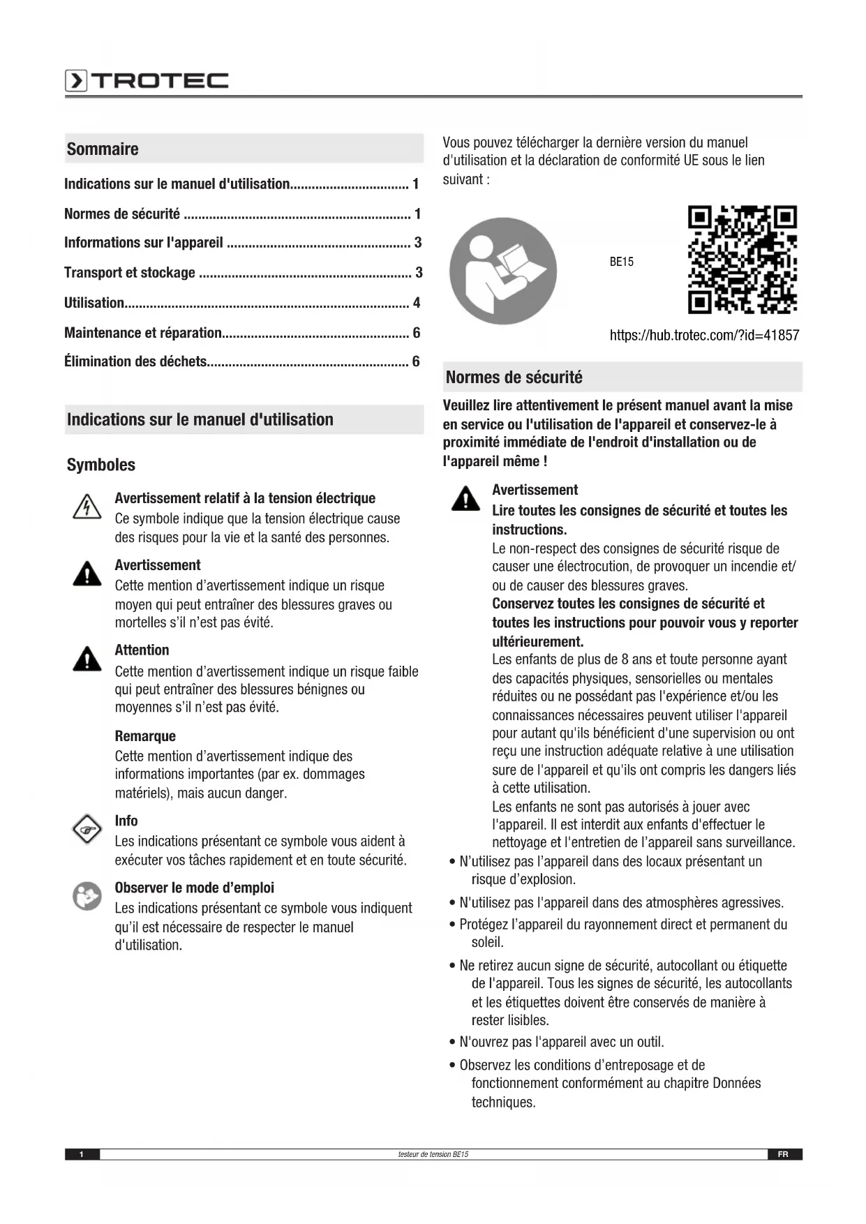 - Élimination des déchets Indications sur le manuel d'utilisation Symboles Avertissement relatif à la tension électrique Ce symbole indique que la tension électrique cause des risques pour la vie et la santé des personnes. Avertissement Cette mention d’avertissement indique un risque moyen qui peut entraîner des blessures graves ou mortelles s’il n’est pas évité. Attention Cette mention d’avertissement indique un risque faible qui peut entraîner des blessures bénignes ou moyennes s’il n’est pas évité. Remarque Cette mention d’avertissement indique des informations importantes (par ex. dommages matériels), mais aucun danger. Info Les indications présentant ce symbole vous aident à exécuter vos tâches rapidement et en toute sécurité. Observer le mode d’emploi Les indications présentant ce symbole vous indiquent qu’il est nécessaire de respecter le manuel d'utilisation. Vous pouvez télécharger la dernière version du manuel d'utilisation et la déclaration de conformité UE sous le lien suivant: BE15 https://hub.trotec.com/?id=41857 Normes de sécurité Veuillez lire attentivement le présent manuel avant la mise en service ou l'utilisation de l'appareil et conservez-le à proximité immédiate de l'endroit d'installation ou de l'appareil même! Avertissement Lire toutes les consignes de sécurité et toutes les instructions. Le non-respect des consignes de sécurité risque de causer une électrocution, de provoquer un incendie et/ ou de causer des blessures graves. Conservez toutes les consignes de sécurité et toutes les instructions pour pouvoir vous y reporter ultérieurement. Les enfants de plus de 8 ans et toute personne ayant des capacités physiques, sensorielles ou mentales réduites ou ne possédant pas l'expérience et/ou les connaissances nécessaires peuvent utiliser l'appareil pour autant qu'ils bénéficient d'une supervision ou ont reçu une instruction adéquate relative à une utilisation sure de l'appareil et qu'ils ont compris les dangers liés à cette utilisation. Les enfants ne sont pas autorisés à jouer avec l'appareil. Il est interdit aux enfants d'effectuer le nettoyage et l'entretien de l’appareil sans surveillance. p. 6