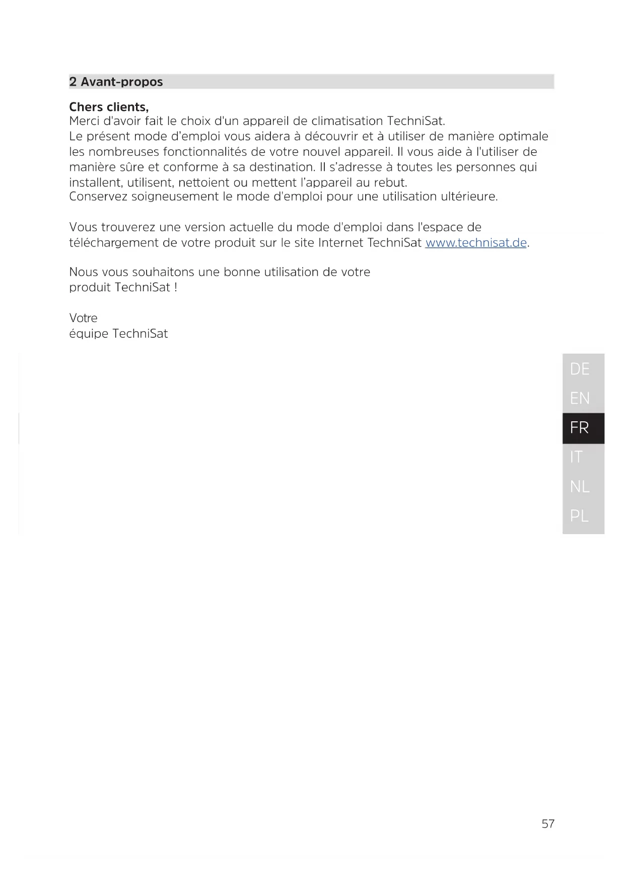 2 Avant-propos Chers clients, Merci d'avoir fait le choix d'un appareil de climatisation TechniSat. Le présent mode d’emploi vous aidera à découvrir et à utiliser de manière optimale les nombreuses fonctionnalités de votre nouvel appareil. Il vous aide à l'utiliser de manière sûre et conforme à sa destination. Il s’adresse à toutes les personnes qui installent, utilisent, neoient ou meent l’appareil au rebut. Conservez soigneusement le mode d'emploi pour une utilisation ultérieure. Vous trouverez une version actuelle du mode d'emploi dans l'espace de téléchargement de votre produit sur le site Internet TechniSat www.technisat.de. Nous vous souhaitons une bonne utilisation de votre produit TechniSat ! Votre équipe TechniSat58 3 Consignes de sécurité