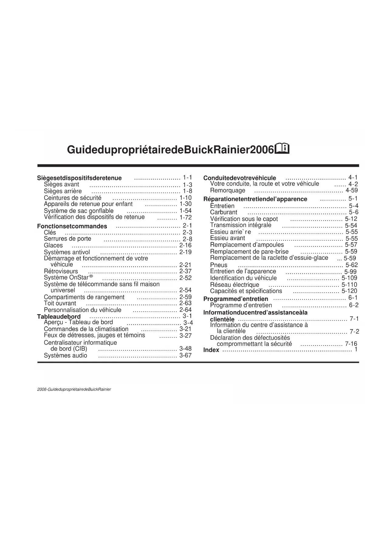 Guide du propriétaire de Buick Rainier 2006 M 2006 - Guide du propriétaire de Buick RainierGENERAL MOTORS, GM, l’emblème GM, BUICK, l’emblème BUICK, et le nom RAINIER sont des marques déposées de la General Motors Corporation. Ce guide comprend les mises à jour au moment de sa publication. Nous nous réservons le droit d’effectuer des modifications après la parution du présent guide sans avertissement supplémentaire. Pour les véhicules vendus au Canada à l’origine, on remplacera le nom k Buick Motor Division l par General Motors du Canada Limitée quand il apparaît dans ce guide. Conserver ce guide dans le véhicule. Vous l’aura ainsi à portée de la main en cas de besoin sur la route. Si le véhicule est vendu, laisser le guide à l’acheteur. Propriétaires canadiens On peut obtenir un exemplaire de ce guide en anglais auprès du concessionnaire ou à l’adresse suivante : Helm, Incorporated P.O. Box 07130 Detroit, MI 48207 Utilisation de votre guide Nombreux sont ceux qui lisent entièrement le guide d’utilisation lorsqu’ils prennent livraison de leur nouveau véhicule. Cela peut en effet vous aider à mieux connaître les fonctions et les commandes du véhicule. Pour expliquer les différentes notions, le guide conjugue le texte et les images. Index L’index, à la fin du guide, est un bon endroit où l’on peut rapidement trouver des renseignements sur le véhicule. Il s’agit d’une liste alphabétique des articles du guide, avec le numéro de la page comportant l’article en question. Imprimé au Canada Numéro de pièce 06RAINIER FR