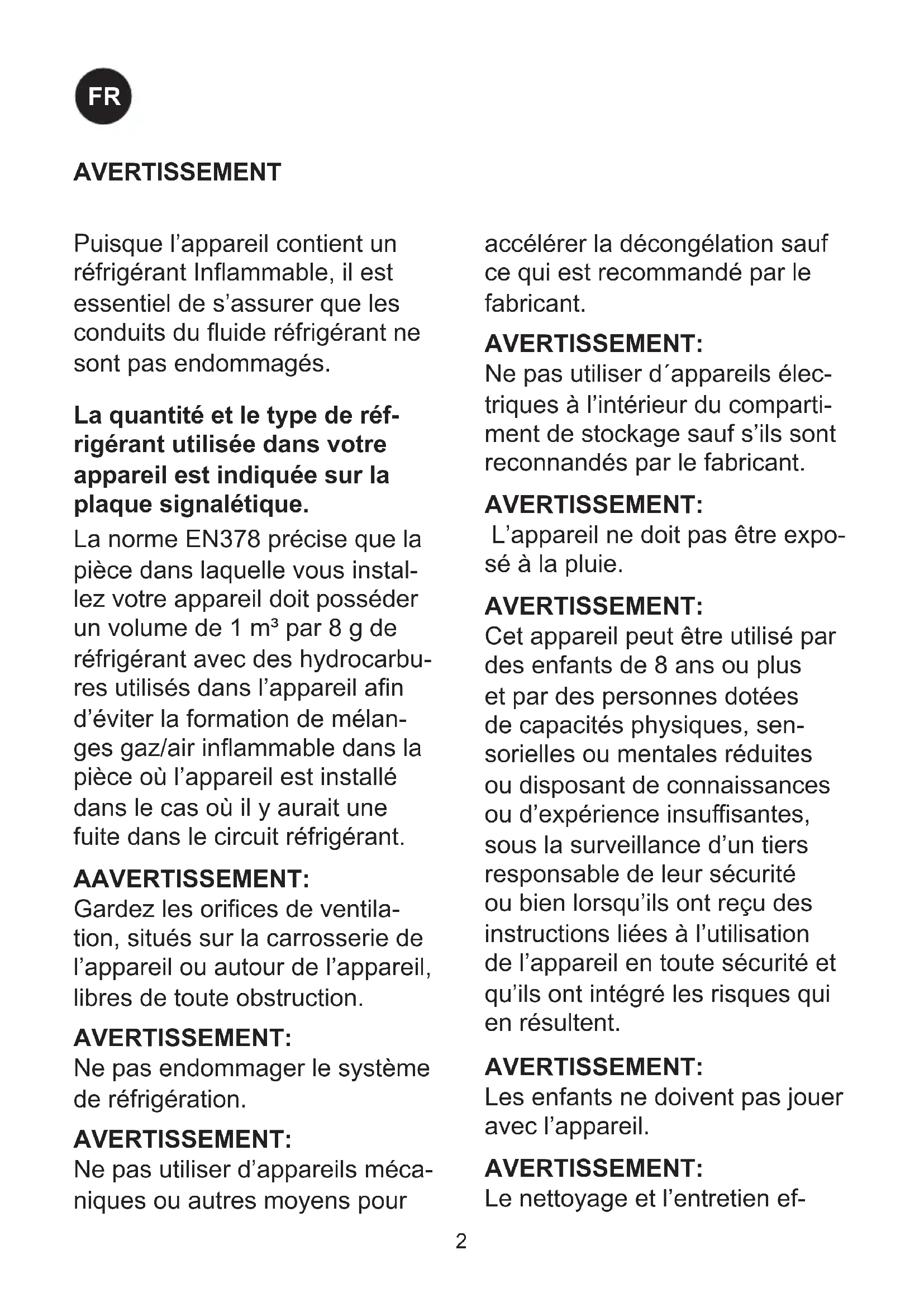 GBPuisque l’appareil contient un réfrigérant Inammable, il est essentiel de s’assurer que les conduits du uide réfrigérant ne sont pas endommagés. La quantité et le type de réf- rigérant utilisée dans votre appareil est indiquée sur la plaque signalétique. La norme EN378 précise que la pièce dans laquelle vous instal- lez votre appareil doit posséder un volume de 1 m³ par 8 g de réfrigérant avec des hydrocarbu- res utilisés dans l’appareil an d’éviter la formation de mélan- ges gaz/air inammable dans la pièce où l’appareil est installé dans le cas où il y aurait une fuite dans le circuit réfrigérant. AAVERTISSEMENT: Gardez les orices de ventila- tion, situés sur la carrosserie de l’appareil ou autour de l’appareil, libres de toute obstruction.