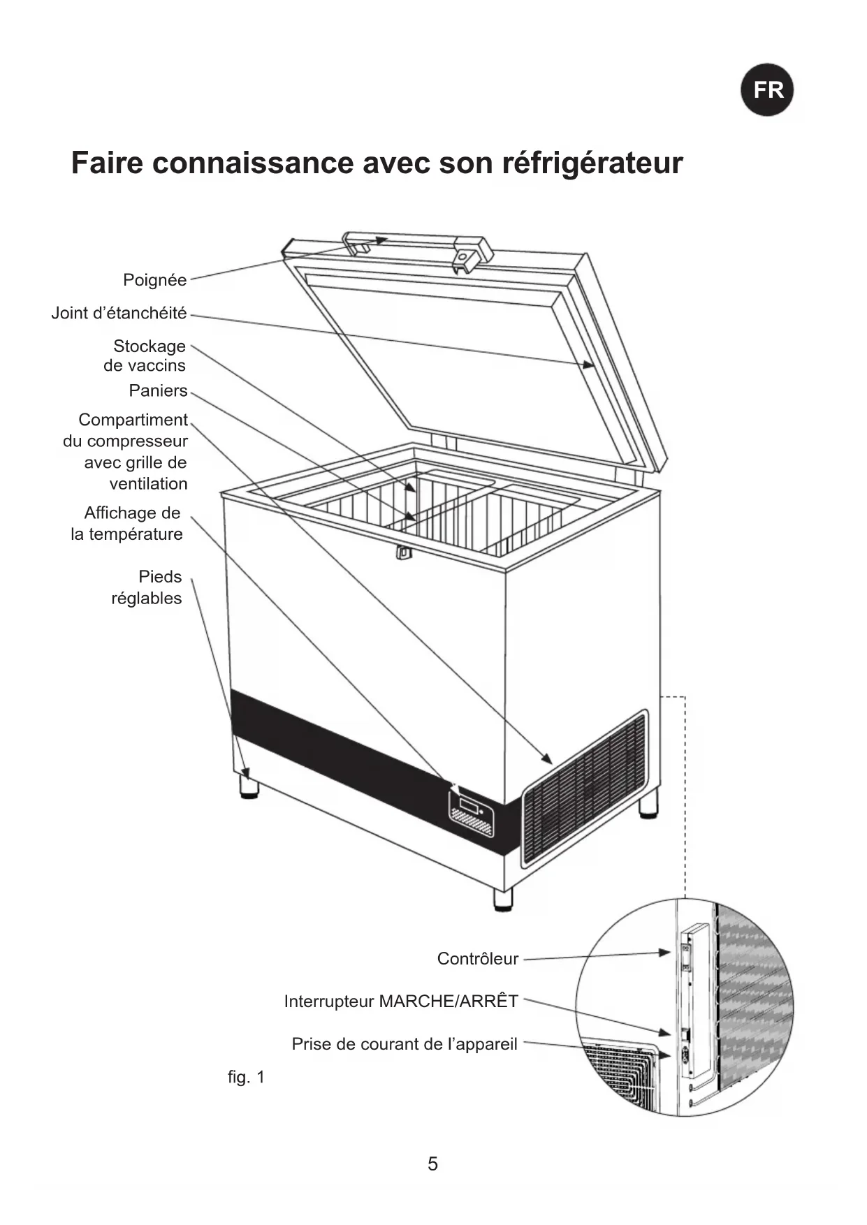 FRFaire connaissance avec son réfrigérateur Poignée Joint d’étanchéité Stockage de vaccins Compartiment du compresseur avec grille de ventilation Achage de la température Pieds réglables Paniers g. 1 Contrôleur Interrupteur MARCHE/ARRÊT Prise de courant de l’appareil
