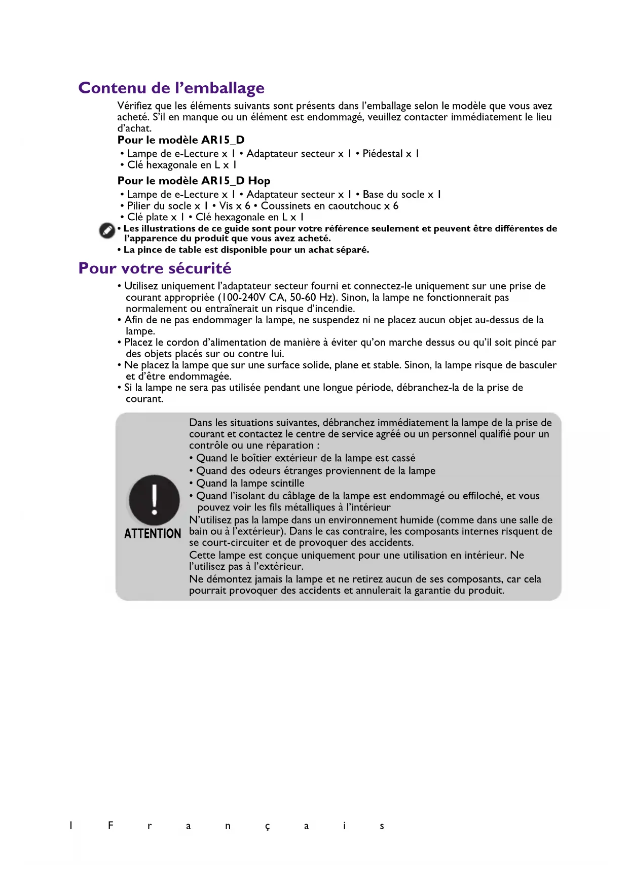 - Quand l’isolant du câblage de la lampe est endommagé ou effiloché, et vous pouvez voir les fils métalliques à l’intérieur N’utilisez pas la lampe dans un environnement humide (comme dans une salle de bain ou à l’extérieur). Dans le cas contraire, les composants internes risquent de se court-circuiter et de provoquer des accidents. Cette lampe est conçue uniquement pour une utilisation en intérieur. Ne l’utilisez pas à l’extérieur. Ne démontez jamais la lampe et ne retirez aucun de ses composants, car cela pourrait provoquer des accidents et annulerait la garantie du produit. ATTENTION2Français Installation Pour le modèle AR15_D avec piédestal
