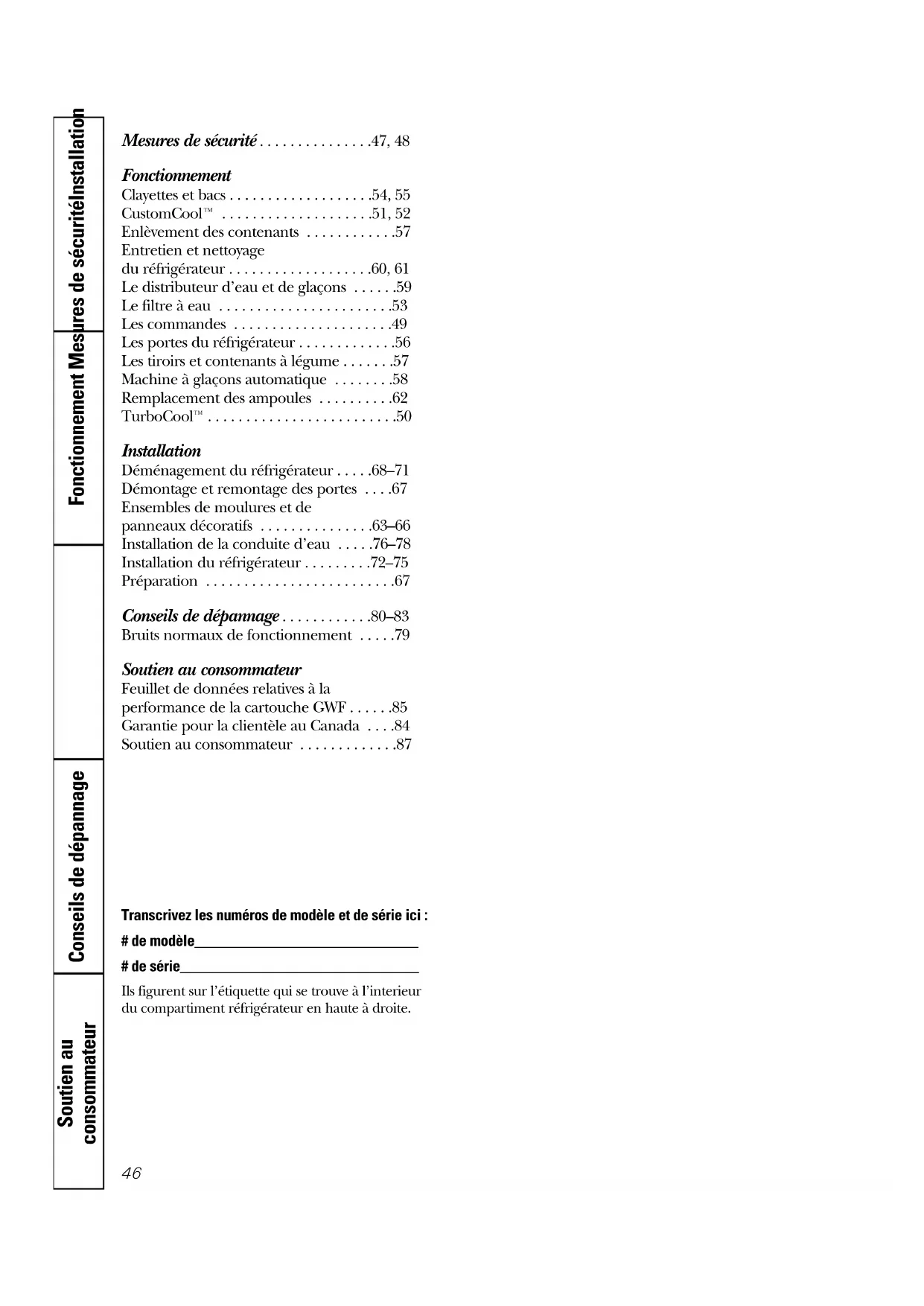 Notes.87 Soutien au consommateur. Site Web appareils électroménagers GE electromenagersge.ca Vous avez une question ou vous avez besoin d’aide pour votre appareil électroménager? Contactez-nous par Internet au site electromenagersge.ca 24 heures par jour, tous les jours de l’année. Service de réparations 1.800.361.3400 Service de réparations GE est tout près de vous. Pour faire réparer votre électroménager GE, il suffit de nous téléphoner. Studio de conception réaliste Sur demande, GE peut fournir une brochure sur l’aménagement d’une cuisine pour les personnes à mobilité réduite. Écrivez: Directeur, Relations avec les consommateurs, Camco, Inc. Bureau 310, 1 Factory Lane Moncton, N.B. E1C 9M3 Prolongation de garantie electromenagersge.ca Achetez un contrat d’entretien GE avant que votre garantie n’expire et bénéficiez d’un rabais substantiel. Ainsi le service après-vente GE sera toujours là après expiration de la garantie. Visitez notre site Web ou appelez-nous au 1.800.461.3636. Pièces et accessoires Ceux qui désirent réparer eux-mêmes leurs électroménagers peuvent recevoir pièces et accessoires directement à la maison (cartes VISA, MasterCard et Discover acceptées). Les directives stipulées dans le présent manuel peuvent être effectuées par n’importe quel utilisateur. Les autres réparations doivent généralement être effectuées par un technicien qualifié. Soyez prudent, car une réparation inadéquate peut affecter le fonctionnement sécuritaire de l’appareil. Vous trouverez dans les pages jaunes de votre annuaire le numéro du Centre de service Camco le plus proche. Autrement, appelez-nous au 1.888.261.3055. Contactez-nous Si vous n’êtes pas satisfait du service après-vente dont vous avez bénéficié : Premièrement, communiquez avec les gens qui ont réparé votre appareil. Ensuite, si vous n’êtes toujours pas satisfait envoyez tous les détails–numéro de téléphone compris–au Directeur, Relations avec les consommateurs, Camco, Inc. Bureau 310, 1 Factory Lane Moncton, N.B. E1C 9M3 Inscrivez votre appareil électroménager electromenagersge.ca Inscrivez votre appareil électroménager en direct, aussitôt que possible. Cela améliorera nos communications et notre service après-vente. Vous pouvez également nous envoyer par la poste le formulaire d’inscription joint à votre documentation.Servicio al consumidor Solucionar problemas Operación SeguridadInstalación Información de seguridad. . . . . . . 89, 90 Instrucciones de operación Cómo sacar las gavetas . . . . . . . . . . . . . . 99 Cuidado y limpieza del refrigerador. . . . . . . . . . . . . . . . . . 102, 103 CustomCool