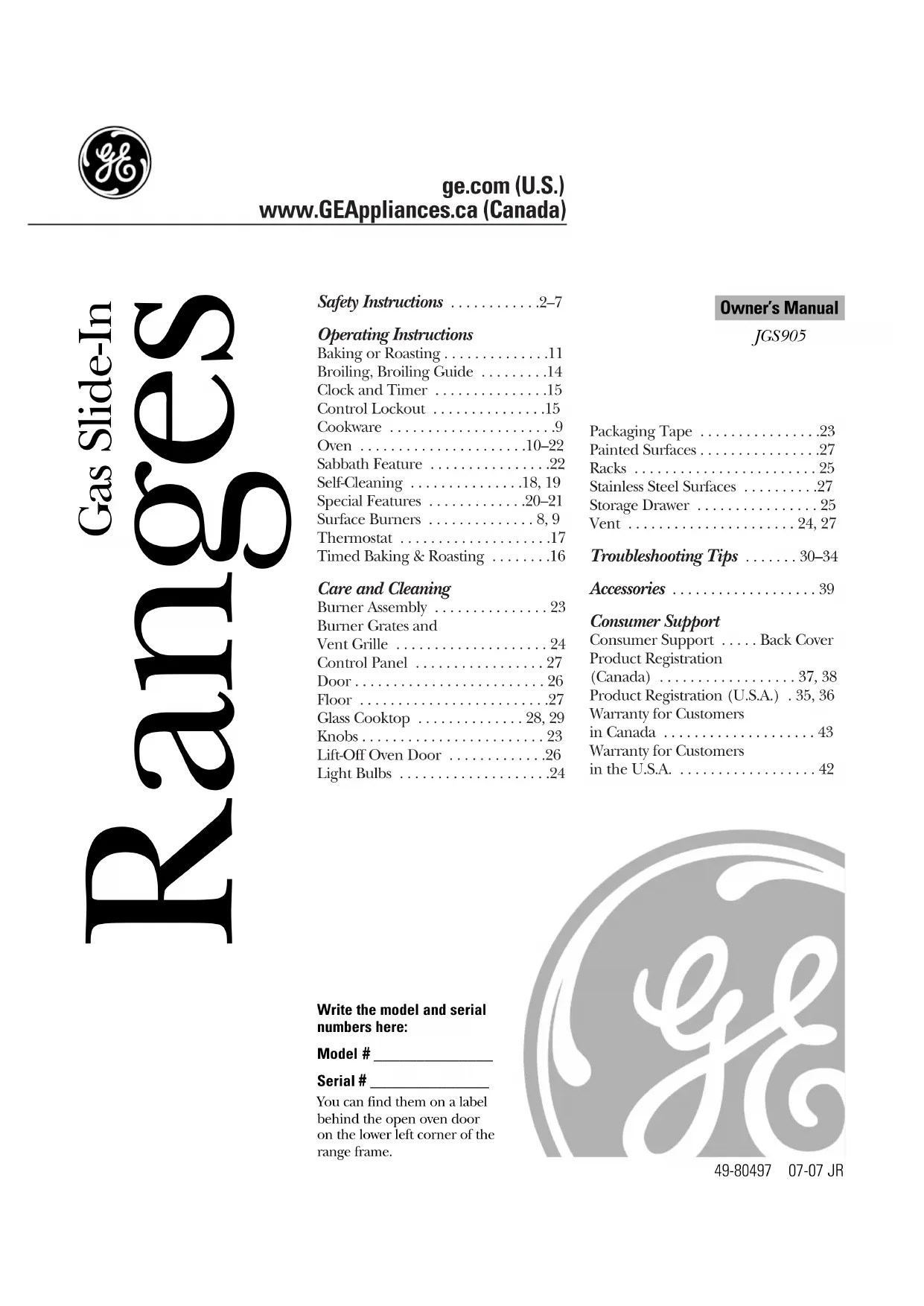 Instructions de sécurité Mode d'emploi Entretien et nettoyage Conseils de dépannage Soutien à la clientèle Notes. www.electromenagersge.ca38 Soutien à la clientèle Conseils de dépannage Entretien et nettoyage Mode d'emploi Instructions de sécurité Notes.39 Safety Instructions Operating Instructions Instructions de sécurité Mode d'emploi Entretien et nettoyage Conseils de dépannage Soutien à la clientèle ■ Les déplacements du service pour vous enseigner comment utiliser le produit. ■ Mauvaise installation, livraison ou maintenance. ■ Défaillance du produit suite à un abus, mauvaise utilisation ou utilisation à des fins autres que celles prévues ou utilisation commerciale. ■ Dommages à la surface de cuisson de verre par des déversements durcis de produits sucrés ou du plastique fondu non nettoyés selon le mode d’emploi du manuel du propriétaire. ■ Dommages à la surface de cuisson de verre en utilisant des nettoyants autres que les crèmes de nettoyage recommandées. ■ Remplacement des fusibles résidentielles ou réinitialisation des disjoncteurs. ■ Dommages au produit suite à un accident, incendie, inondations ou force majeure. ■ Dommages indirects ou consécutifs causés par des défauts possibles de l’appareil. ■ Dommages après la livraison. ■ Le service s’il est impossible d’avoir accès au produit pour ce faire. Ce que Mabe ne couvre pas : Garantie de la cuisinière au gaz GE. Tous les services sous garantie sont fournis par nos centres de service ou un technicien de service autorisé à la clientèle. Pour le service, composez le 1.800.361.3400. Veuillez fournir le numéro de série et le numéro de modèle lorsque vous appelez pour obtenir le service. Agrafez votre reçu ici. La preuve de date d’achat original est nécessaire pour obtenir l’entretien et les réparations sous la garantie. LE GARANT N’EST PAS RESPONSABLE DES DOMMAGES INDIRECTS. Garant : MABE CANADA INC. Pour la période de : Mabe remplacera : Un an Toute pièce de la cuisinière qui connaît une défaillance suite à un défaut de matériau De la date de ou de fabrication. Durant cette année de garantie limitée, Mabe fournira aussi, sans frais, l’achat original tous les services à la maison et tous les frais de main d’oeuvre pour remplacer la pièce défectueuse. EXCLUSION DE GARANTIES IMPLICITES – Votre seul et unique recours est la réparation du produit selon les dispositions de cette Garantie limitée. Toutes les garanties implicites, incluant les garanties de commercialité et d’adéquation à un usage spécifique, sont limitées à une année ou à la période la plus courte autorisée par la législation.Imprimé aux États-Unis Soutien à la clientèle. Site Web appareils électroménagers GE www.electromenagersge.ca Vous avez une question ou vous avez besoin d’aide pour votre appareil électroménager? Contactez-nous par Internet au site www.electromenagersge.ca 24 heures par jour, tous les jours de l’année. Service de réparations 1.800.361.3400 Service de réparations GE est tout près de vous. Pour faire réparer votre électroménager GE, il suffit de nous téléphoner au 1.800.361.3400. Studio de conception réaliste Sur demande, GE peut fournir une brochure sur l’aménagement d’une cuisine pour les personnes à mobilité réduite. Écrivez: Directeur, Relations avec les consommateurs, Mabe Canada Inc. Bureau 310, 1 Factory Lane Moncton, N.B. E1C 9M3 Prolongation de garantie www.electromenagersge.ca Achetez un contrat d’entretien GE avant que votre garantie n’expire et bénéficiez d’un rabais substantiel. Ainsi le service après-vente GE sera toujours là après expiration de la garantie. Visitez notre site Web ou appelez-nous au 1.800.461.3636. Pièces et accessoires Ceux qui désirent réparer eux-mêmes leurs électroménagers peuvent recevoir pièces et accessoires directement à la maison (cartes VISA, MasterCard et Discover acceptées). Les directives stipulées dans le présent manuel peuvent être effectuées par n’importe quel utilisateur. Les autres réparations doivent généralement être effectuées par un technicien qualifié. Soyez prudent, car une réparation inadéquate peut affecter le fonctionnement sécuritaire de l’appareil. Vous trouverez dans les pages jaunes de votre annuaire le numéro du Centre de service Mabe le plus proche. Contactez-nous Si vous n’êtes pas satisfait du service après-vente dont vous avez bénéficié : Premièrement, communiquez avec les gens qui ont réparé votre appareil. Ensuite, si vous n’êtes toujours pas satisfait envoyez tous les détails–numéro de téléphone compris–au Directeur, Relations avec les consommateurs, Mabe Canada Inc. Bureau 310, 1 Factory Lane Moncton, N.B. E1C 9M3 Inscrivez votre appareil électroménager www.electromenagersge.ca Inscrivez votre appareil électroménager en direct, aussitôt que possible. Cela améliorera nos communications et notre service après-vente. Vous pouvez également nous envoyer par la poste le formulaire d’inscription joint à votre documentation.
