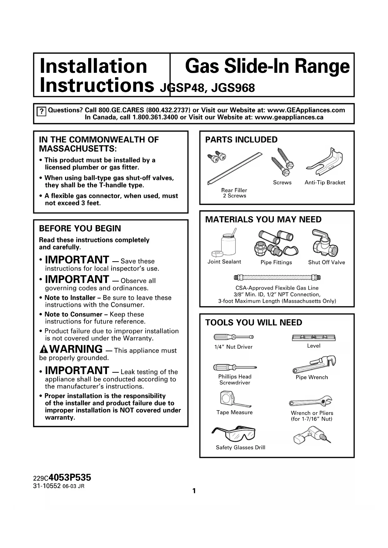 350A4502P355 31-47024 06-03 JRSi vous avez des questions, appelez le 1.800.361.3400 ou visitez notre site Web à l’adresse :www.electromenagersge.ca Instructions Cuisinière encastrée d’installation au gaz JGSP48, JGS968