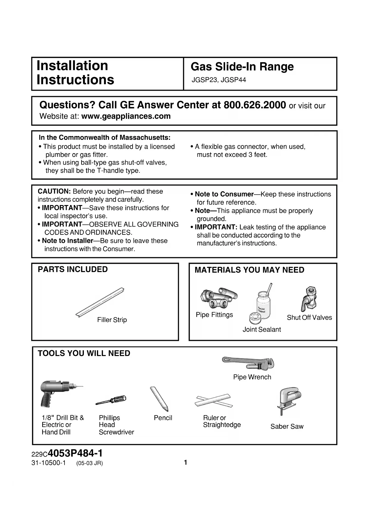 NOTES16 NOTES1 229C4053P484-1 31-10500-1 (05-03 JR) Cuisinière du gaz encastrée Instructions d’installation MISE EN GARDE : Avant de commencer, lisez attentivement la totalité de ces instructions.
