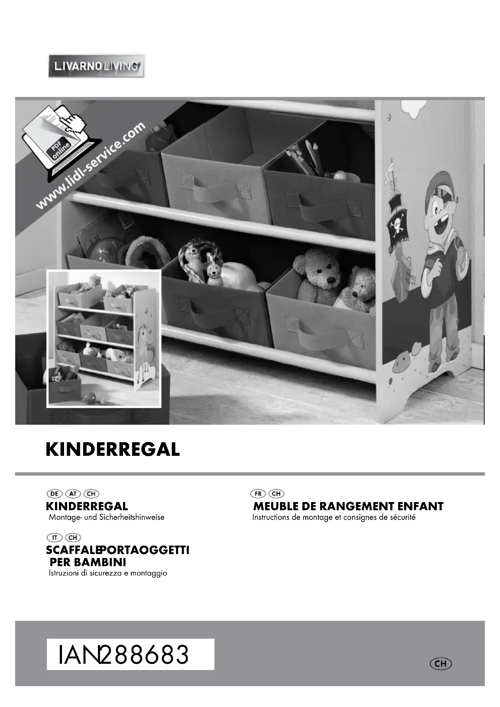 Recyclage L’emballage se compose de matières recyclables qui peuvent être mises au rebut dans les déchetteries locales. Les possibilités de recyclage des produits usés sont à demander auprès de votre municipalité. Garantie Le produit a été fabriqué selon des critères de qua- lité stricts et contrôlé consciencieusement avant sa livraison. En cas de défaillance, vous êtes en droit de retourner ce produit au vendeur. La présente ga- rantie ne constitue pas une restriction de vos droits légaux. Ce produit bénéficie d‘une garantie de 3 ans à compter de sa date d’achat. La durée de garantie débute à la date d’achat. Veuillez conserver le ticket de caisse original. Il fera office de preuve d’achat. Si un problème matériel ou de fabrication devait survenir dans 3 ans suivant la date d‘achat de ce produit, nous assurons à notre discrétion la répara- tion ou le remplacement du produit sans frais sup- plémentaires. La garantie prend fin si le produit est endommagé suite à une utilisation inappropriée ou à un entretien défaillant. La garantie couvre les vices matériels et de fabrica- tion. Cette garantie ne s’étend ni aux pièces du produit soumises à une usure normale (p. ex. des piles) et qui, par conséquent, peuvent être considé- rées comme des pièces d’usure, ni aux dommages sur des composants fragiles, comme des interrup- teurs, des batteries ou des éléments fabriqués en verre.5 IT/CH Scaffale portaoggetti per bambini Introduzione Congratulazioni per l‘acquisto del vostro nuovo prodotto. Con esso avete optato per un prodotto di qualità. Familiarizzare con il prodotto prima di met- terlo in funzione per la prima volta. A tale scopo, leggere attentamente le seguenti istruzioni d‘uso e le avvertenze di sicurezza. Utilizzare il prodotto solo come descritto e per i campi di applicazione indicati. Conservare le presenti istruzioni. Conse- gnare tutta la documentazione in caso di cessione del prodotto a terzi.