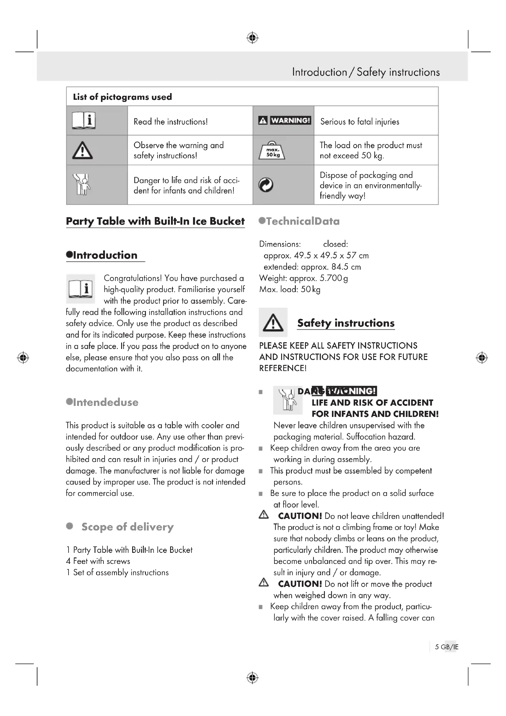 Manufacturer … / Assembly / Cleaning and Care / Disposal / Warranty and Service Manufacturer Test Rite Germany Import GmbH Merkurring 82 22143 Hamburg Germany phone: 00 49 40 60687037 info@testrite.de8 FR/BE … / … / Nettoyage et entretien / Mise au rebut / Garantie et service après-vente Introduction / Indications de sécurité Table de fête avec fonction réfrigérante Introduction Félicitations ! Vous avez opté pour un pro- duit de grande qualité. Familiarisez-vous avec le produit avant de procéder au montage. Lisez pour cela attentivement la notice de montage suivante et les indications de sécurité. Uti- lisez ce produit uniquement conformément aux ins- tructions et dans les domaines d’application spécifiés. Veuillez conserver soigneusement cette notice. Lorsque vous remettez l‘appareil à d‘autres utilisateurs, veuil- lez également leur transmettre tous les documents liés à celui-ci. Utilisation conforme Ce produit a été développé comme une table ser- vant de support de refroidissement, et convient à un usage en extérieur. Toute utilisation autre que celle décrite ci-dessus ou toute modification du produit n’est pas autorisée et peut occasionner des blessures et / ou un endommagement du produit. Le fabricant décline toute responsabilité pour les dommages ré- sultant d‘une utilisation non conforme. Le produit n’est pas destiné à une utilisation commerciale. Contenu de la livraison 1 Table de fête avec fonction réfrigérante 4 Pieds avec vis 1 Notice de montage Caractéristiques techniques Dimensions : à l‘état fermé : env. 49,5x49,5x57 cm à l‘état déployé : env. 84,5 cm Poids : env. 5,700 g Charge max. : 50 kg Indications de sécurité
