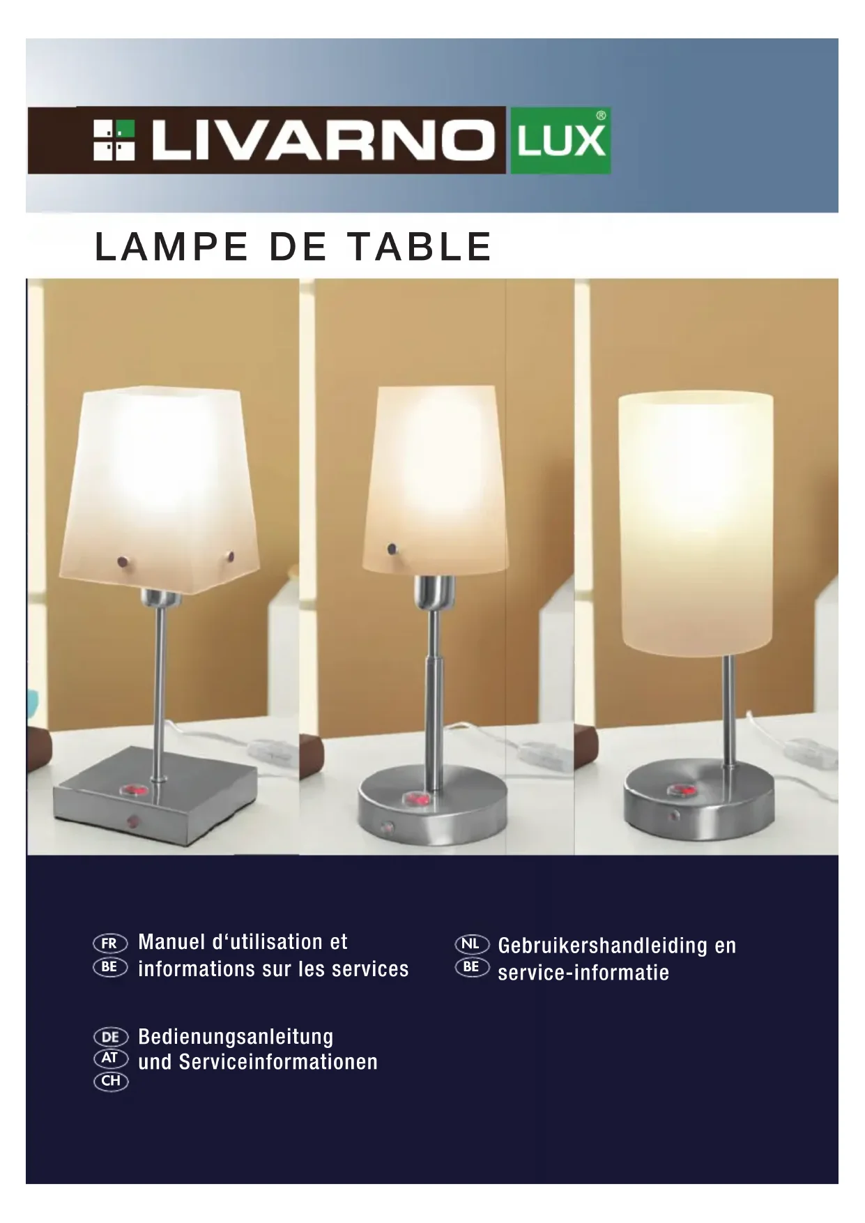 Câble d'alimentation Pour débrancher le cordon d’alimentation, tirez toujours sur sa fiche et non sur le câble lui-même. Ne placez jamais de meubles, d'objets lourds ou la lampe elle- même sur le câble et veillez à ce que le câble ne s'emmêle pas. Ne faites jamais de nœuds avec le câble et ne le raccordez à aucun autre câble. Tous les câbles doivent être placés de façon à ne pas gêner la circulation et à ce que l’on ne risque pas de trébucher dessus. N'utilisez jamais d'adaptateurs ou de rallonges non conformes aux normes de sécurité en vigueur dans votre pays et ne modifiez pas les câbles vous-même. Utilisation prévue La lampe de table à économie d’énergie TL1710 peut être utilisée en guise de lampe occasionnelle à économie d’énergie. La lampe s’éteint et s’allume de manière aléatoire et permet donc de faire facilement croire que vous êtes chez vous et ainsi d’empêcher les éventuels cambriolages. Souvenez-vous que cette fonction ne vous dispense pas de l’obligation de fermer et verrouiller les portes et les fenêtres de votre domicile. Cette lampe n’est pas conçue pour être utilisée avec un variateur d’intensité. Veillez toujours à ce que la lampe repose sur une surface stable. Cette lampe n’est pas destinée à un usage commercial. Toute modification apportée à l’appareil et non expressément approuvée par le fabricant peut avoir pour conséquence que ces normes ne sont plus respectées. Conformité Cet appareil a été testé et certifié conforme aux exigences de base et aux autres règlements de la directive sur la compatibilité électromagnétique 2004/108/EC et de la directive concernant les appareils basse tension 2006/95/EC en vigueur.Lampe de table à économie d‘énergie TL1710 Français - 6 Caractéristiques techniques Modèle A Modèle B Modèle C Fabricant : LivarnoLux Nom du modèle : TL1710 Tension de fonctionnement : 230 V ~ 50 Hz Longueur du câble : 2 m Ampoule : Ampoule à économie d’énergie 11 W Catégorie d’efficacité énergétique A, avec douille : E14 Dimensions de l’abat-jour : Modèle A Hauteur : environ 20 cm Diamètre : environ 12,5 cm Modèle B Hauteur : environ 15 cm Dimensions en bas : environ 12,5 cm Dimension au sommet : environ 9,5 cm Modèle C Hauteur : environ 15 cm En bas : environ 12,5 x 12,5 cm Au sommet : environ 9,5 x 9,5 cmLampe de table à économie d‘énergie TL1710