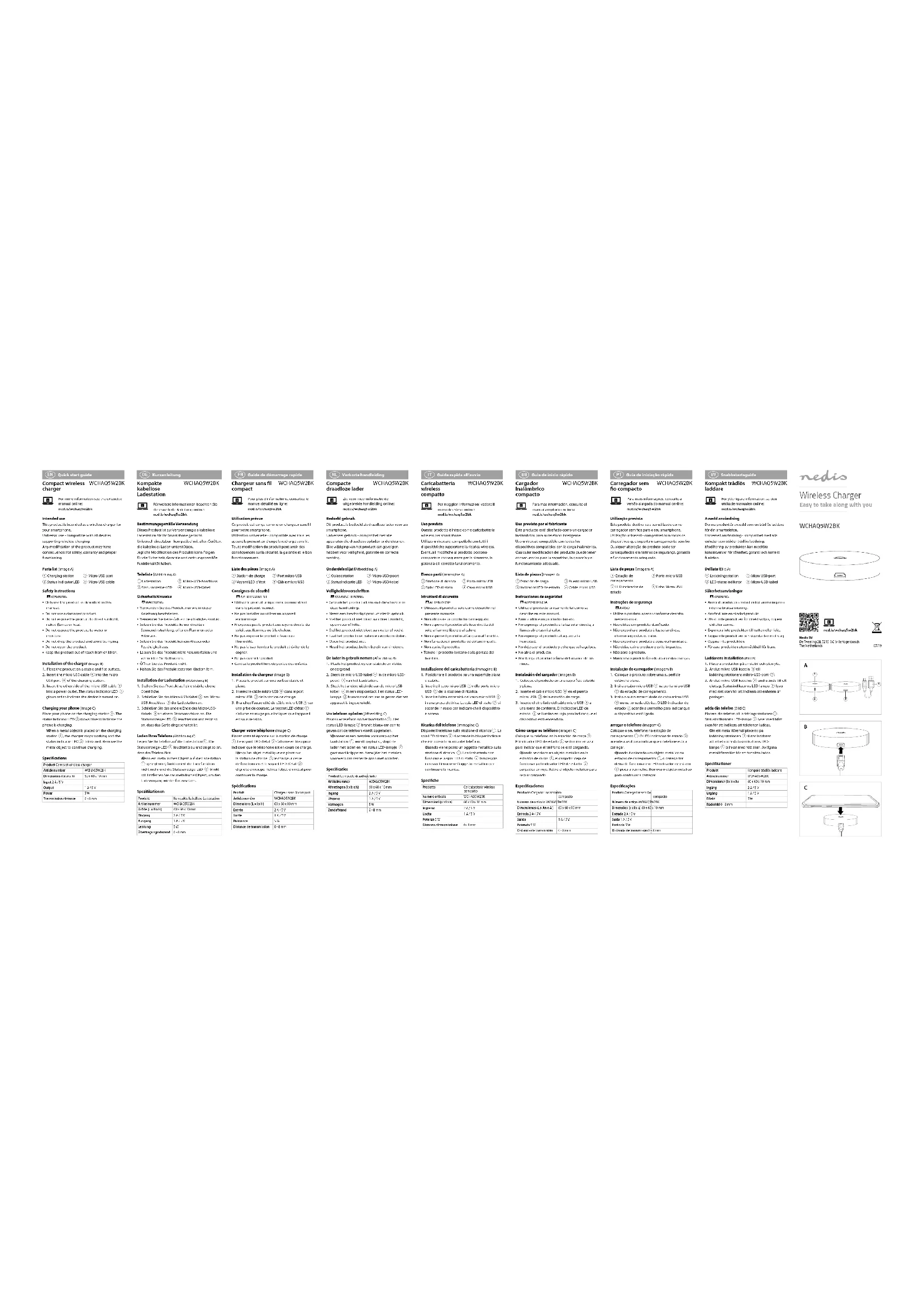 Pour plus d'informations, consultez le manuel détaillé en ligne:ned.is/wchaq5w2bkUtilisation prévueCe produit est conçu comme un chargeur sans l pour votre smartphone.Utilisation universelle - compatible avec tous les appareils prenant en charge la recharge sans l.Toute modication du produit peut avoir des conséquences sur la sécurité, la garantie et le bon fonctionnement.Liste des pièces (Image A) Station de charge Port micro USB Voyant LED d’état Câble micro USBConsignes de sécurité - AVERTISSEMENT• Utilisez le produit uniquement comme décrit dans le présent manuel.• Ne pas installer ou utiliser un appareil endommagé.• N'exposez pas le produit aux rayons directs du soleil, aux ammes ou à la chaleur.• Ne pas exposer le produit à l'eau ou à l'humidité.• Ne pas laisser tomber le produit et éviter de le cogner.• Ne pas ouvrir le produit.• Gardez le produit hors de portée des enfants.Installation du chargeur (Image B)1. Placez le produit sur une surface stable et plane.2. Insérez le câble micro USB dans le port micro USB de la station de charge.3. Branchez l’autre côté du câble micro USB sur une prise de courant. Le voyant LED d’état