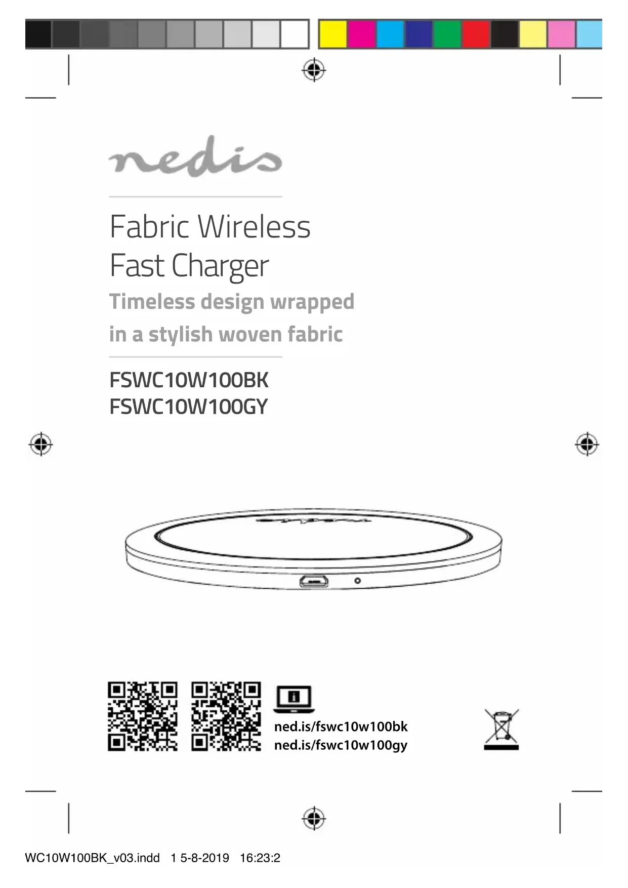 Câble USB Spécications Produit Chargeur rapide sans l en tissu 10 W Article numéro FSWC10W100BK / FSWC10W100GY Dimensions (L x l x H) 82 x 82 x 9 mm Poids 40 g Entrée de connexion Micro USB Technologie sans l Certiée Qi Tension d’entrée 5 V / 2 A, 9 V / 1,67 A Tension de sortie 5 V / 1 A, 9 V / 1,1 A Intensité de sortie Jusqu’à 1,1 A Puissance Jusqu’à 10 W Distance de transmission 2 - 5 mm Puissance max. de transmission radio -4 dBµA/m à 10 m Gamme de fréquences 110 - 187 KHz Déclaration de conformité Nous, Nedis B.V., déclarons en tant que fabricant que le produit FSWC10W100BK / FSWC10W100GY de notre marque Nedis