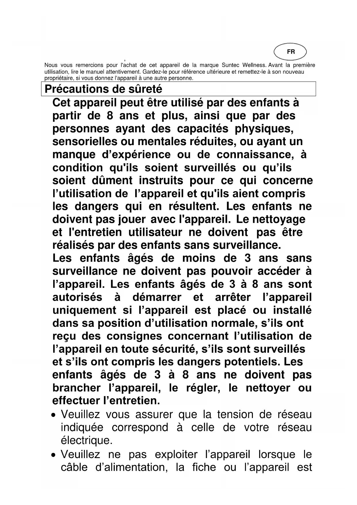 Heat Protect SUNTEC WELLNESS GMBH / HOLZSTRASSE 2 / 40221 DÜSSELDORF / GERMANY Indicationes sobre la protección del medio ambiente Declaración de conformidad EC, Nous vous remercions pour l'achat de cet appareil de la marque Suntec Wellness. Avant la première utilisation, lire le manuel attentivement. Gardez-le pour référence ultérieure et remettez-le à son nouveau propriétaire, si vous donnez l'appareil à une autre personne. Précautions de sûreté Cet appareil peut être utilisé par des enfants à partir de 8 ans et plus, ainsi que par des personnes ayant des capacités physiques, sensorielles ou mentales réduites, ou ayant un manque d’expérience ou de connaissance, à condition qu'ils soient surveillés ou qu’ils soient dûment instruits pour ce qui concerne l’utilisation de l’appareil et qu'ils aient compris les dangers qui en résultent. Les enfants ne doivent pas jouer avec l'appareil. Le nettoyage et l'entretien utilisateur ne doivent pas être réalisés par des enfants sans surveillance. Les enfants âgés de moins de 3 ans sans surveillance ne doivent pas pouvoir accéder à l’appareil. Les enfants âgés de 3 à 8 ans sont autorisés à démarrer et arrêter l’appareil uniquement si l’appareil est placé ou installé dans sa position d’utilisation normale, s’ils ont reçu des consignes concernant l’utilisation de l’appareil en toute sécurité, s’ils sont surveillés et s’ils ont compris les dangers potentiels. Les enfants âgés de 3 à 8 ans ne doivent pas brancher l’appareil, le régler, le nettoyer ou effectuer l’entretien.