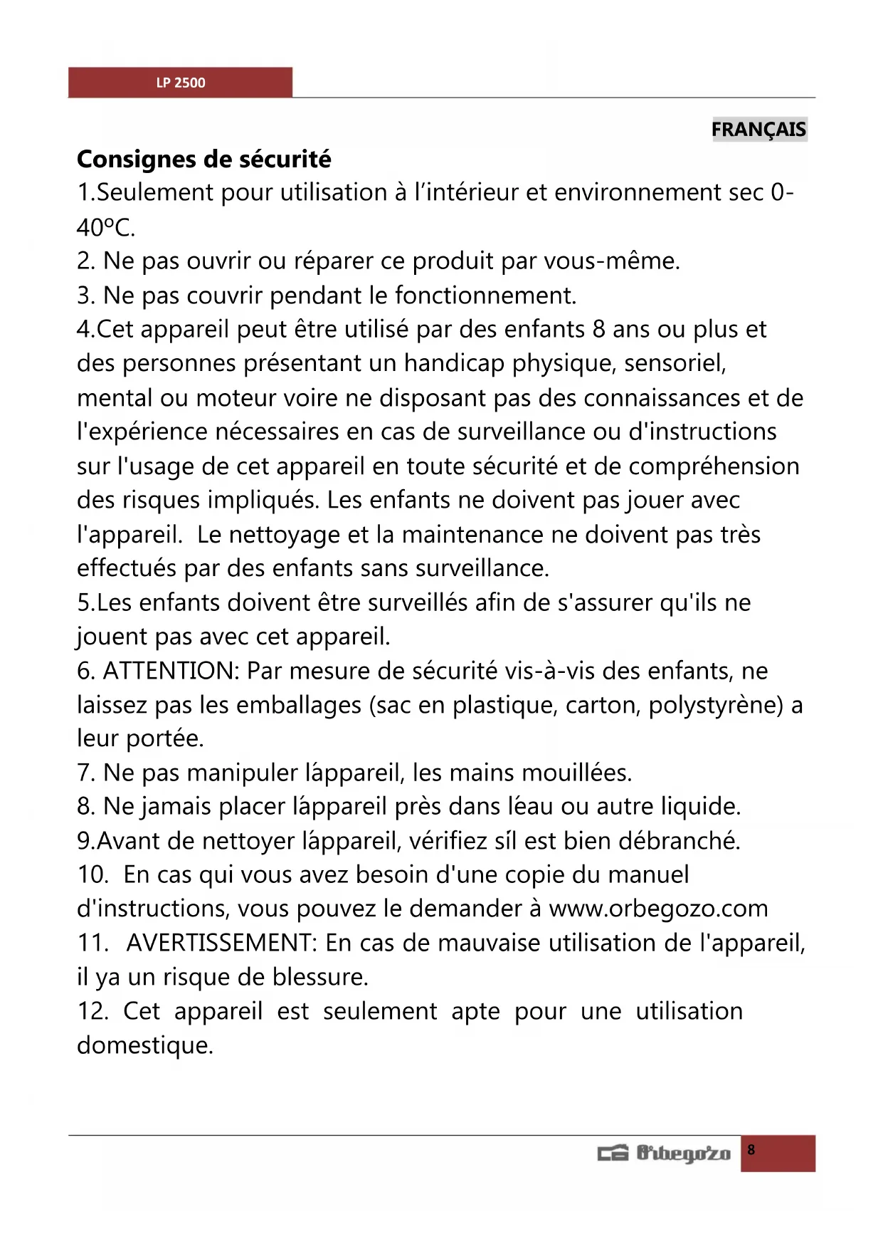 MODE D'EMPLOI LP 2500 Orbegozo