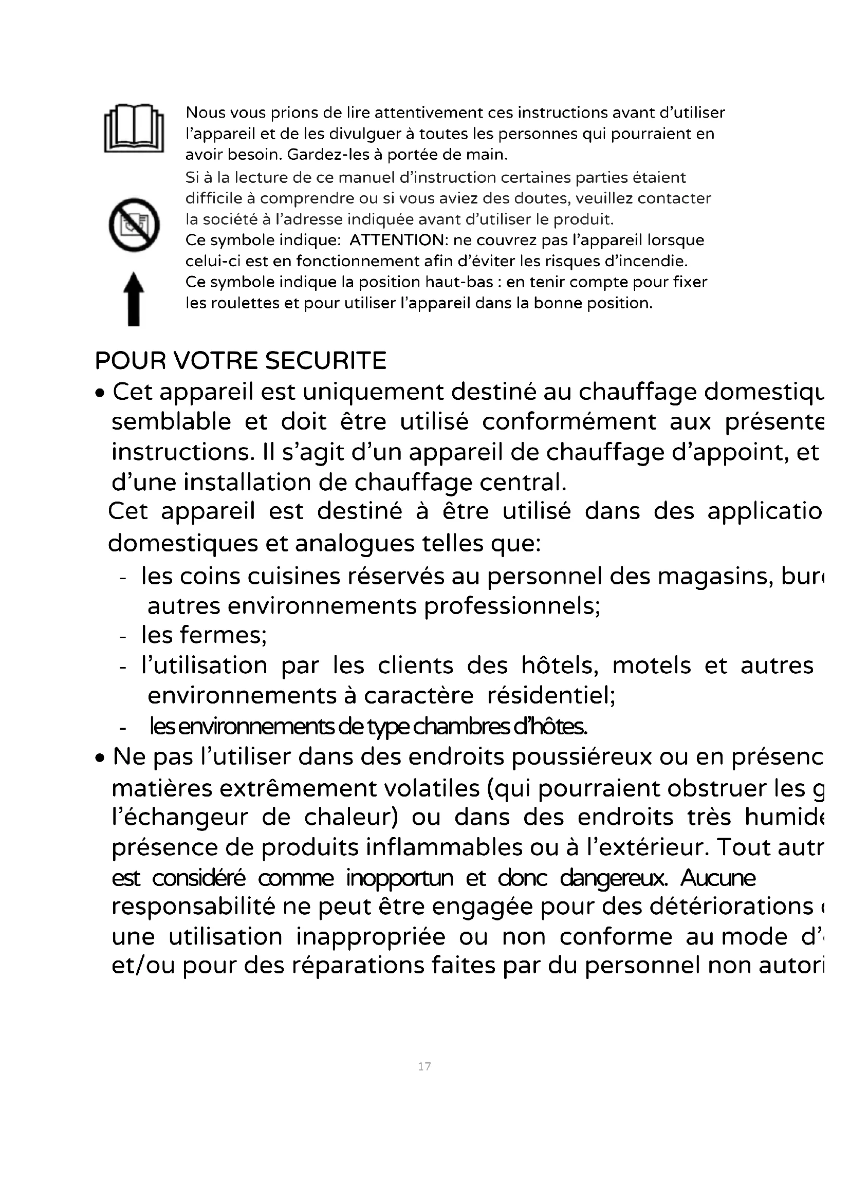 Nous vous prions de lire attentivement ces instructions avant d’utiliser l'appareil et de les divulguer à toutes les personnes qui pourraient en avoir besoin. Gardez-les à portée de main. Si à la lecture de ce manuel d'instruction certaines parties étaient difficile à comprendre ou si vous aviez des doutes, veuillez contacter la société à l'adresse indiquée avant d'utiliser le produit. Ce symbole indique: ATTENTION: ne couvrez pas l’appareil lorsque celui-ci est en fonctionnement afin d’éviter les risques d’incendie. Ce symbole indique la position haut-bas : en tenir compte pour fixer les roulettes et pour utiliser l’appareil dans la bonne position.