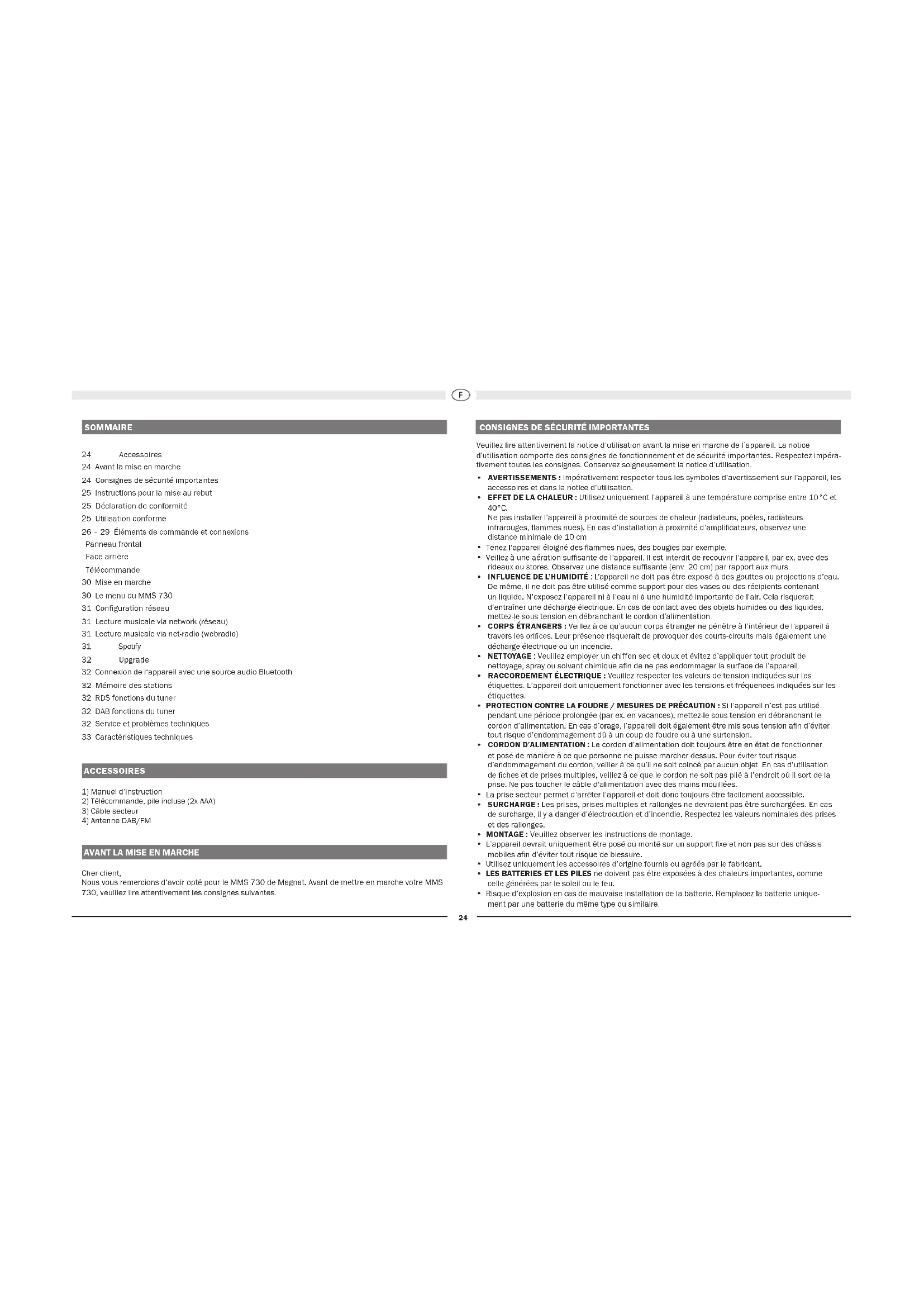 Power input: Maximum 20 W Standby < 0.5 W Subject to technical change. SPECIFICATIONS24 SOMMAIRE 24 Accessoires 24 Avant la mise en marche 24 Consignes de sécurité importantes 25 Instructions pour la mise au rebut 25 Déclaration de conformité 25 Utilisation conforme 26 – 29 Éléments de commande et connexions Panneau frontal Face arrière Télécommande 30 Mise en marche 30 Le menu du MMS 730 31 Configuration réseau 31 Lecture musicale via network (réseau) 31 Lecture musicale via net-radio (webradio) 31 Spotify 32 Upgrade 32 Connexion de l‘appareil avec une source audio Bluetooth 32 Mémoire des stations 32 RDS fonctions du tuner 32 DAB fonctions du tuner 32 Service et problèmes techniques 33 Caractéristiques techniques ACCESSOIRES