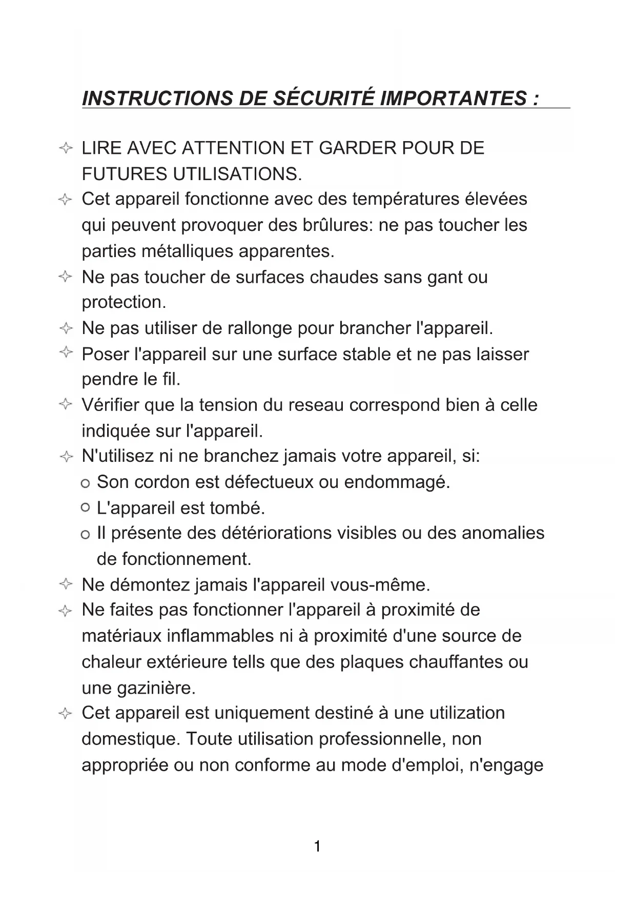 CEMF35B3 CEMF36W CEMF36RLIRE AVEC ATTENTION ET GARDER POUR DE FUTURES UTILISATIONS. Cet appareil fonctionne avec des températures élevées qui peuvent provoquer des brûlures: ne pas toucher les parties métalliques apparentes. Ne pas toucher de surfaces chaudes sans gant ou protection. Ne pas utiliser de rallonge pour brancher l'appareil. Poser l'appareil sur une surface stable et ne pas laisser pendre le l. Vérier que la tension du reseau correspond bien à celle indiquée sur l'appareil. N'utilisez ni ne branchez jamais votre appareil, si: Son cordon est défectueux ou endommagé. L'appareil est tombé. Il présente des détériorations visibles ou des anomalies de fonctionnement. Ne démontez jamais l'appareil vous-même. Ne faites pas fonctionner l'appareil à proximité de matériaux inammables ni à proximité d'une source de chaleur extérieure tells que des plaques chauffantes ou une gazinière. Cet appareil est uniquement destiné à une utilization domestique. Toute utilisation professionnelle, non appropriée ou non conforme au mode d'emploi, n'engage INSTRUCTIONS DE SÉCURITÉ IMPORTANTES : 1ni la responsabilité, ni la garantie du constructeur et du distributeur. Il faut débrancher l'appareil en cas de non utilisation du produit ou avant de le nettoyer. Laisser refroidir l'appareil avant tout nettoyage. Ne pas utiliser l'appareil en extérieur. Ne jamais bouger l'appareil enc ours d'utilisation. Utiliser l'appareil avec sufsamment d'espace tout autour. Veillez à laisser un espace libre à l'avant et sur le côté gauche ou droit de l'appareil. Veillez à ne pas obstruer les prises d'air ou les orices d'évacuation. Après utilization, veillez à éteindre correctement votre appareil. La température de la porte, de la surface extérieure et des surfaces accessibles peut être élevée lorsque l'appareil fonctionne. La porte ou la surface extérieure peut devenir chaude lorsque l'appareil fonctionne. Si le câble d'alimentation est endommagé, il doit être remplacé par le fabricant, son service après-vente ou des personnes de qualication similaire an d'éviter un danger. Maintenir l'appareil et son cordon hors de portée des enfants de moins de 8 ans. La face arrière du four doit être placée contre un mur. 2En ce qui concerne les informations détaillées sur la manière de nettoyer les surfaces en contact avec les aliments, référez-vous à la section “NETTOYAGE ET ENTRETIEN”. Votre appareil a été conçu pour un usage domestique seulement. Il n'a pas été conçu pour être utilise dans les cas suivants: - dans des coins de cuisines réservés au personnel dans des magasins, bureau et autres environnements professionnels, - dans des fermes, - Par les clients des hôtels, motels et autres environnements à caractère résidentiel, - Dans des environnements de type chambres d'hôtes. La lampe doit être exclusivement utilisée pour l'éclairage du four. Elle ne doit pas être utilisée sur des luminaires pour l'éclairage des locaux. Utilisation de la minuterie: tournez à fond et revenez en arrière sur le temps désiré. Cet appareil peut être utilisé par des enfants à partir de 8 ans et plus et par des personnes ayant des capacités physiques, sensorielles ou mentales réduites ou un manqué d'expérience et de connaissances à condition qu'elles aient reçu une supervision ou des instructions concernant l'utilisation de l'appareil en toute sécurité et qu'elles comprennent les dangers encourus. Les enfants ne doivent pas jouer avec l'appareil. Le nettoyage et l'entretien par l'usager ne doivent pas être effectués par des enfants, sauf s'il sont plus de 8 ans et qu'ils sont surveillés. 3L'appareil n'est pas destiné à être mis en fonctionnement au moyen d'une minuterie extérieure ou par un système de commande à distance séparé. La temperature des surfaces accessibles peut être élevée lorsque l'appareil es ten fonctionnement. IMPORTANT